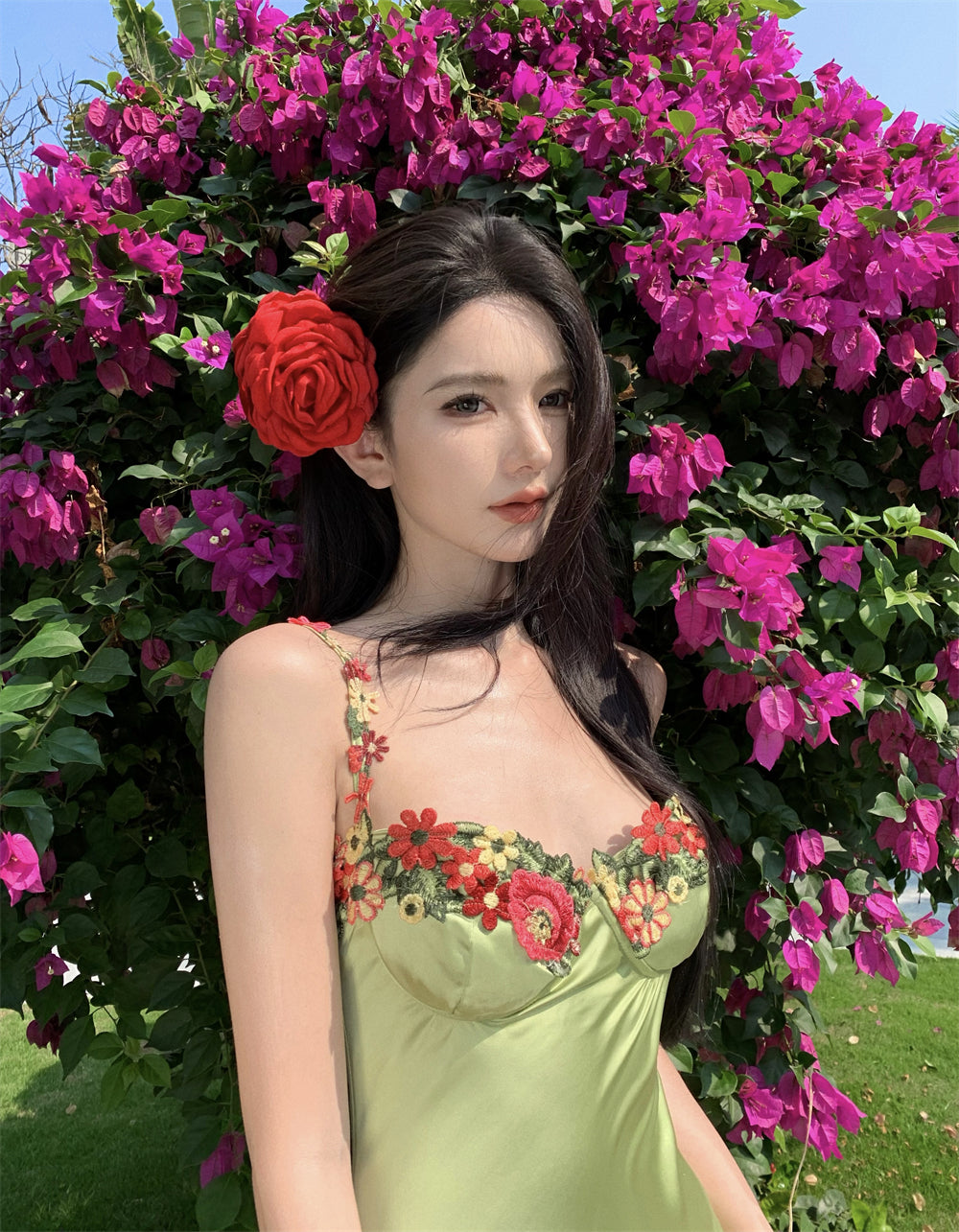 Vibrant Pale Green Satin Bodycon Maxi Dress French Style Spaghetti Straps Floral Embroidery Long Dress AP2071