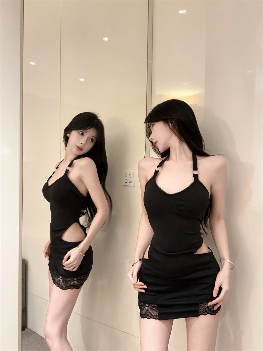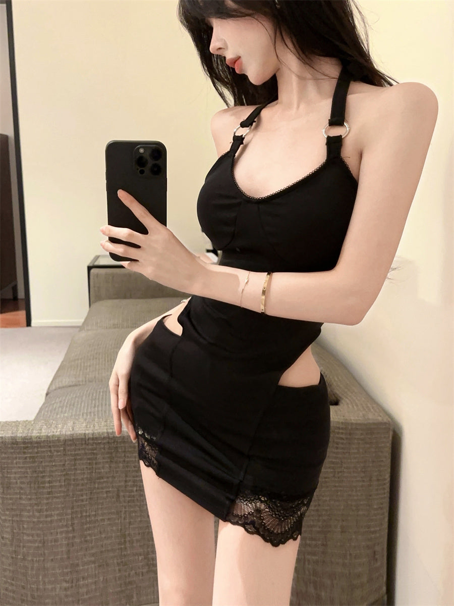 Hot Sales Side Cutouts Lace Trim Black Mini Skirt Elegant Back Tie Bodycon Night Outings Halter Short Dress AP2035