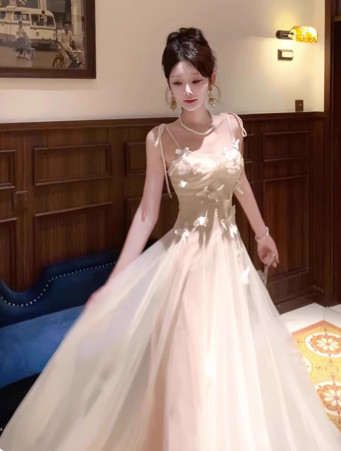 Exquisite Butterflies Design Applique Maxi Dress Elegant Adjustable Spaghetti Strap Cascade Mesh Splicing Long Dress AP1699