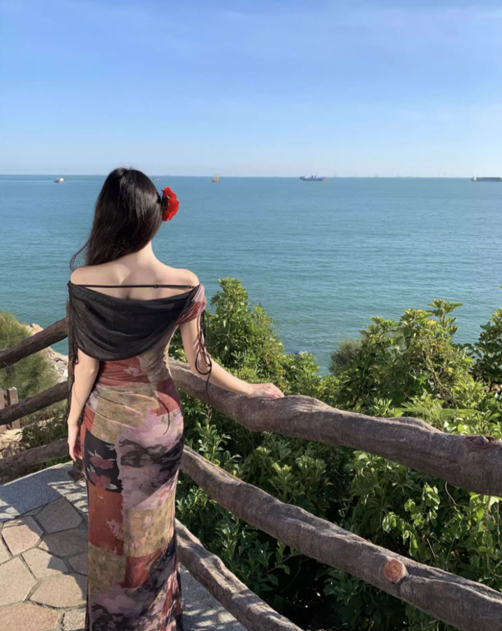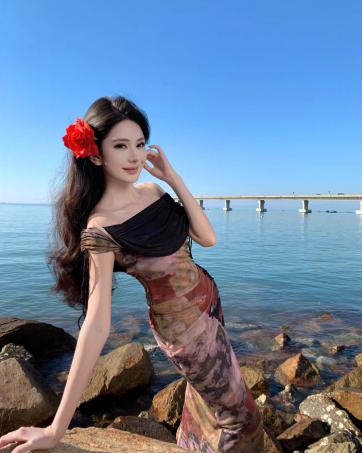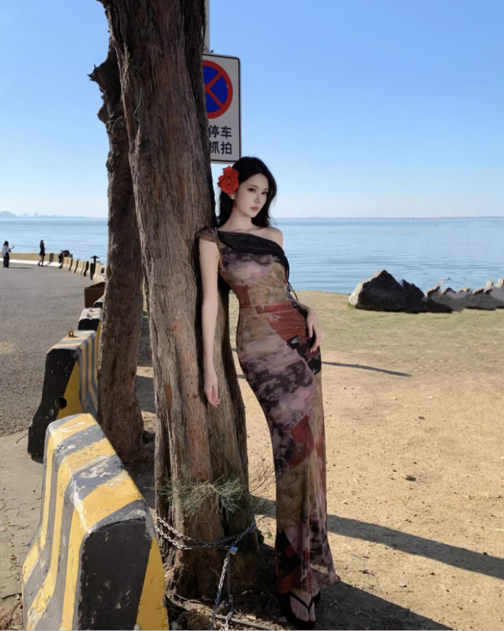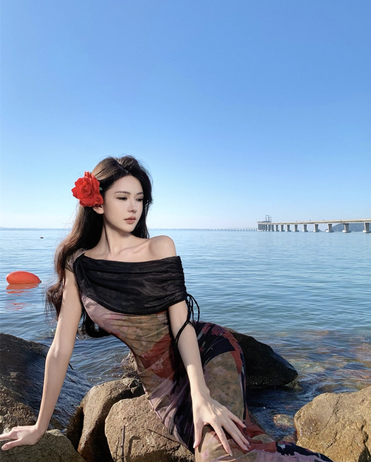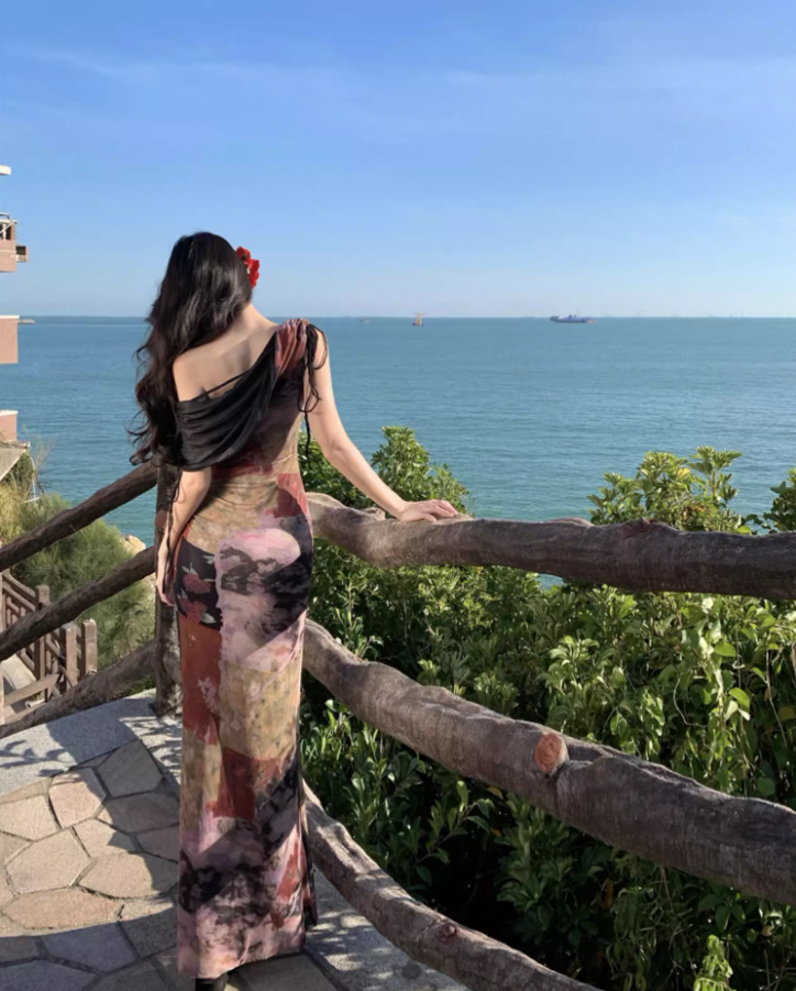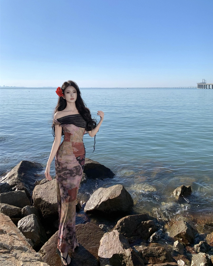 Vintage Asymmetric Draped Neckline Flowy Maxi Dress Chic Off-Shoulder Color-Block Print Long Dress AP1287
