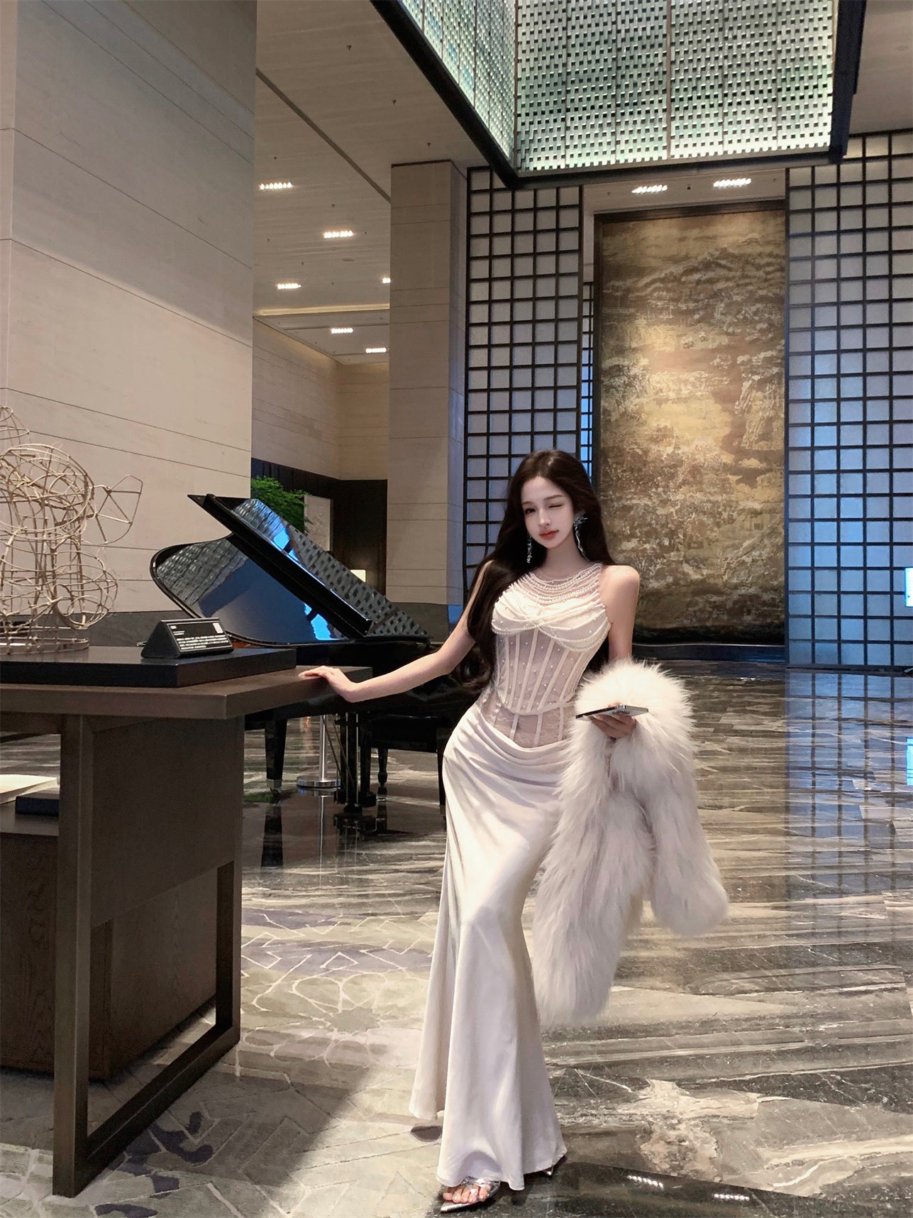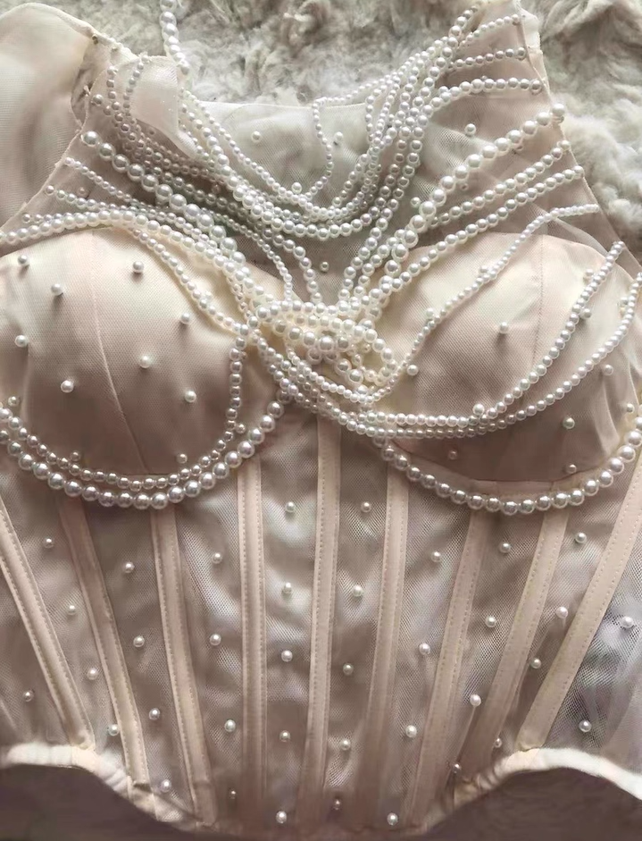 Elegant Ivory Pearl Embellished Bodycon Maxi Skirt Exquisite Beading Transparent Mesh Shoulder Two-Piece Set Halter Long Dress AP1694