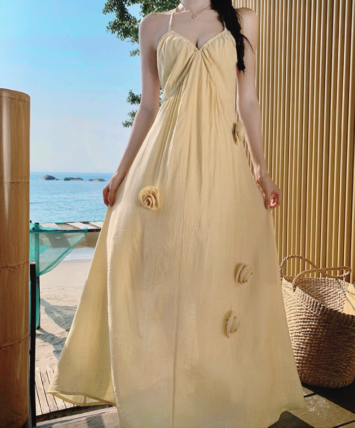 Simple Style Yellow Lightweight Maxi Dress Coastal Shoots Vogue Flowy Flowers Design Halter Long Dress AP1376
