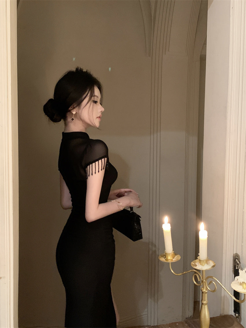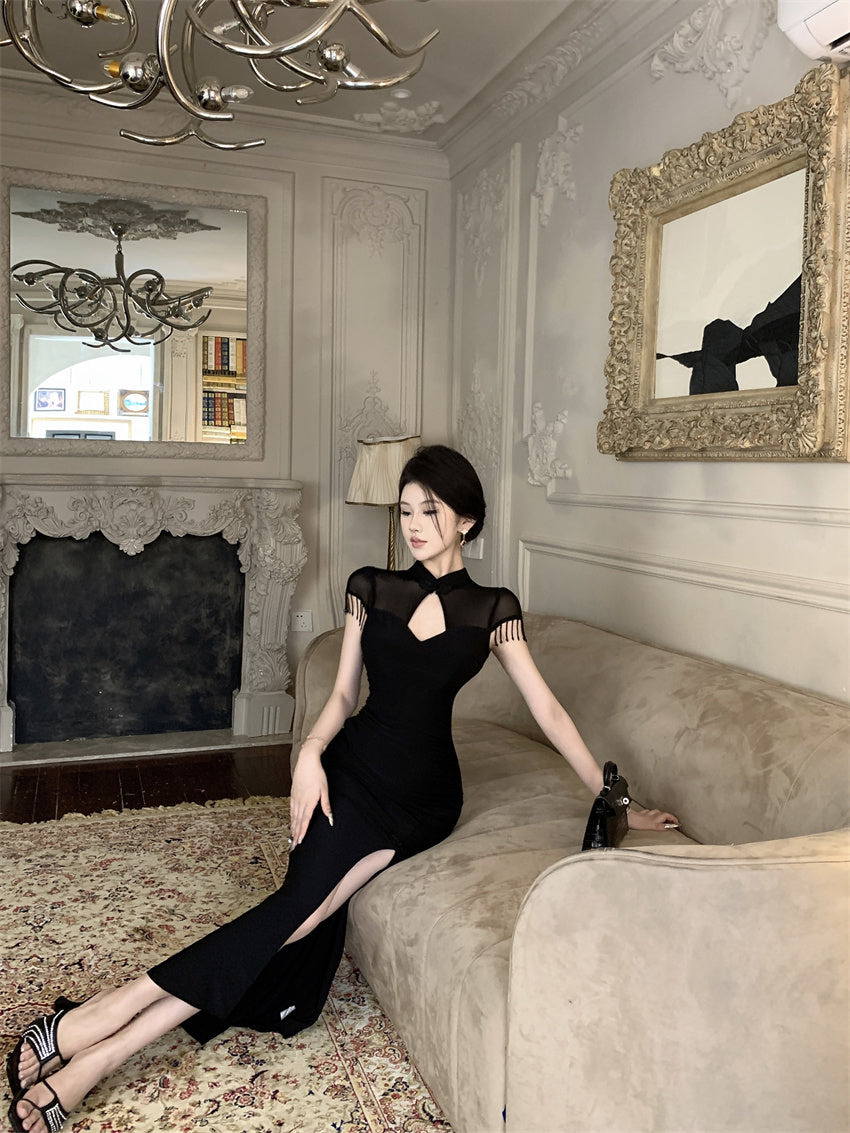 Fantastic Keyhole Cutout High Side Slit Mermaid Maxi Dress Vogue Sheer Mesh Short Sleeves with Fringe Halter Long Dress AP1765