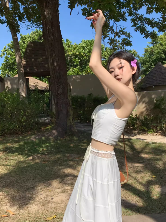 Chic Two-Piece Set Ruffles Hem Island Vacation Maxi Dress Retro Flowy Crop Top Lace-Trimmed Long Dress AP1445