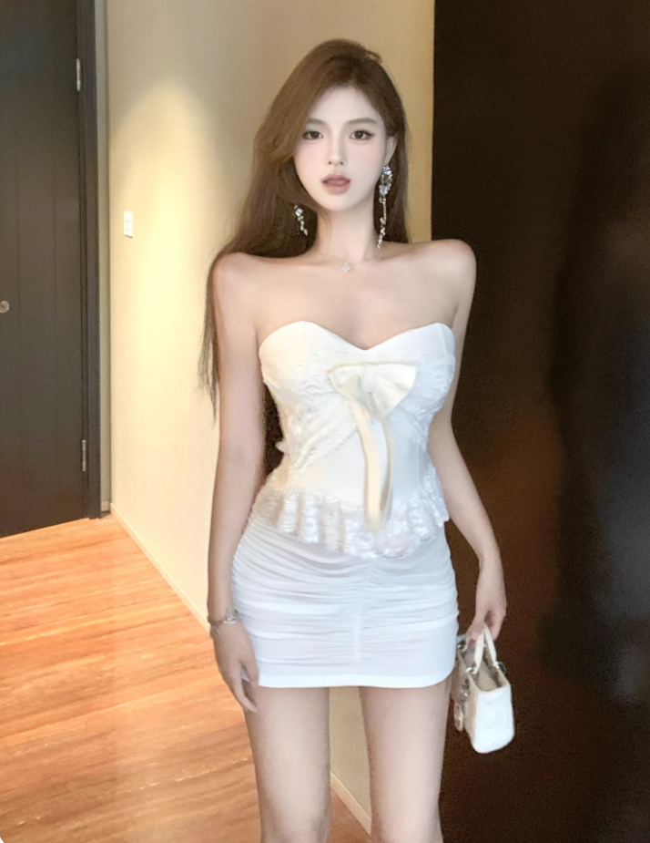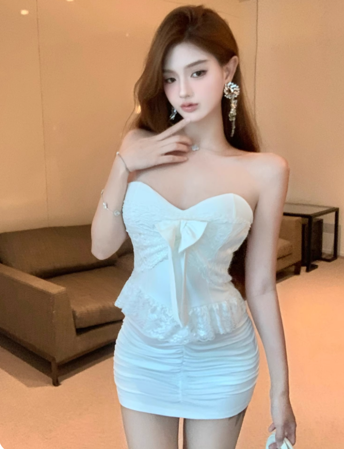 Elegant Bow Accent White Strapless Mini Dress Hot Girls Ruched Lace Trimmed Bodycon Short Dress AP1852
