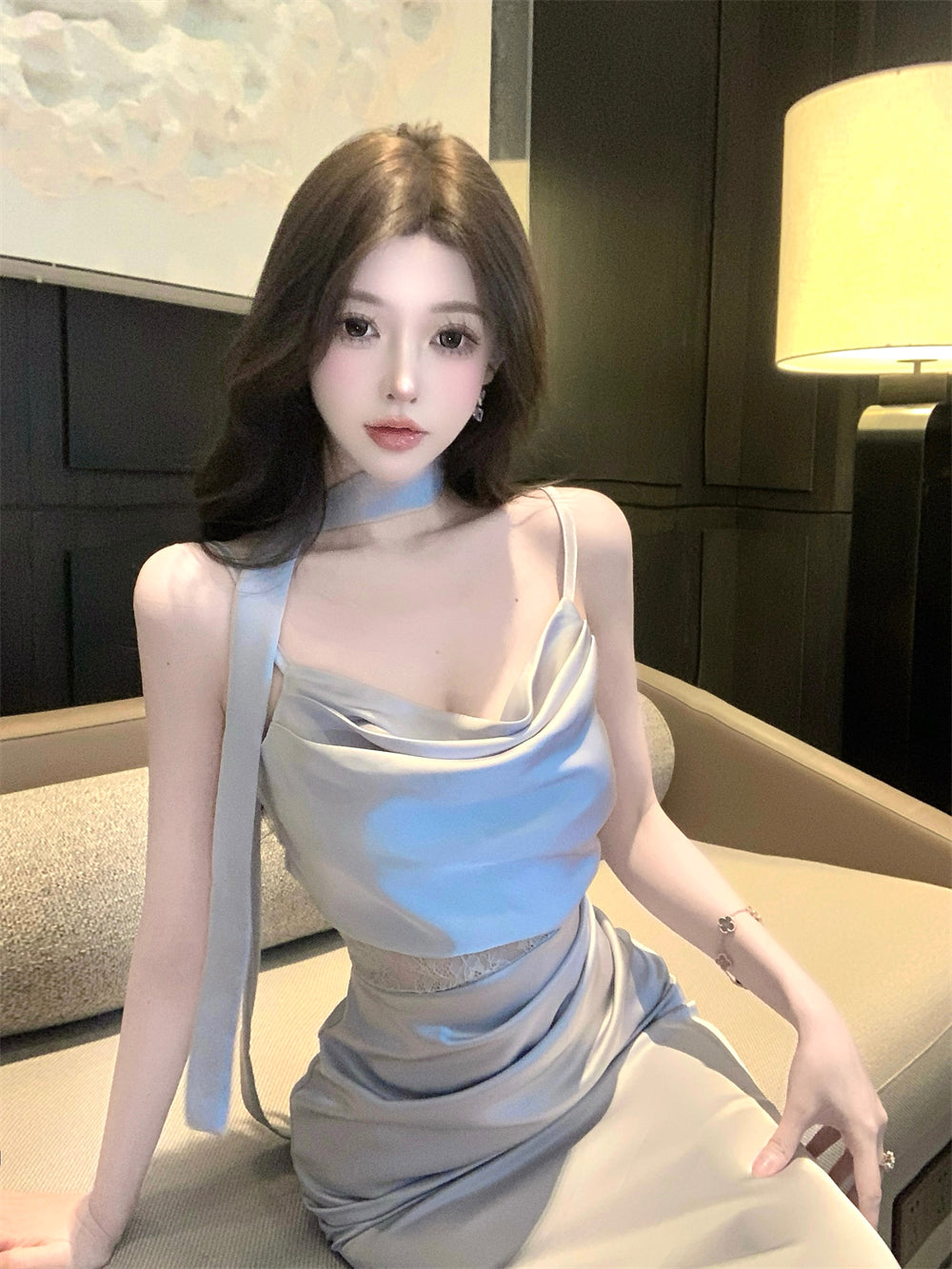 Gorgeous Silver-Blue Cowl Neck Maxi Dress Chic Side Lace Accent Sash Straps Bodycon Fit Long Dress AP1955