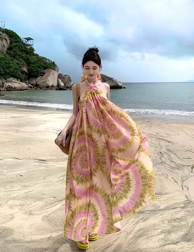 Vigorous Floral Print Tie-Back Maxi Dress Chic Flowy Backless Coastal Trips Halter Long Dress AP1419