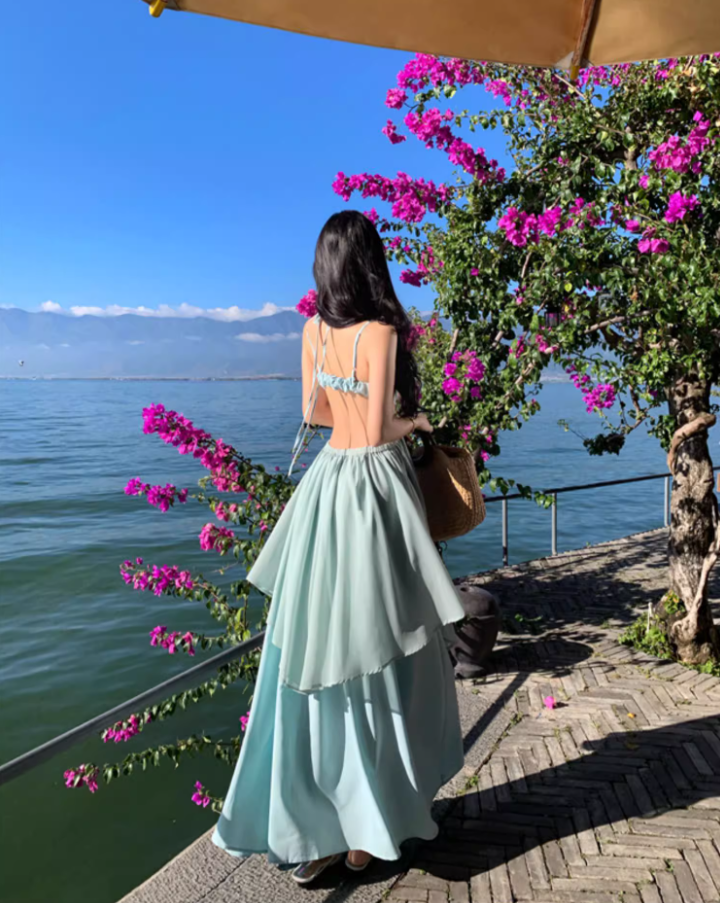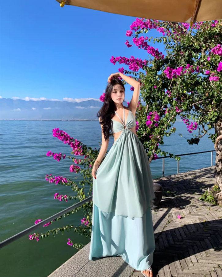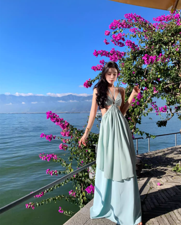 Ethereal Mint Green Spaghetti Strap Maxi Dress Coastal Trips Glamourous Flowy Cutout Waist Long Dress AP1538
