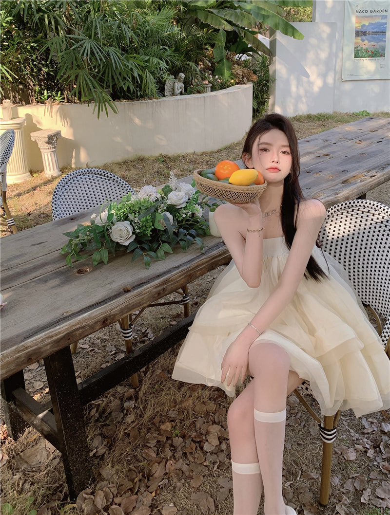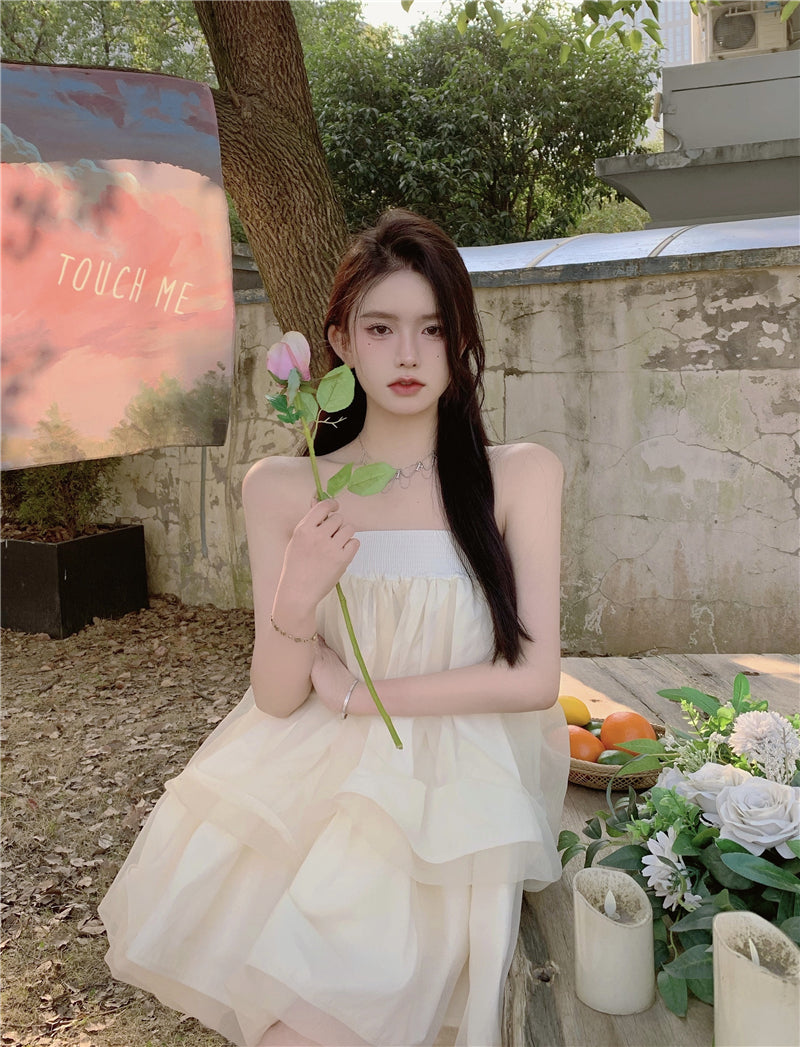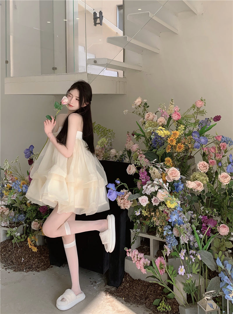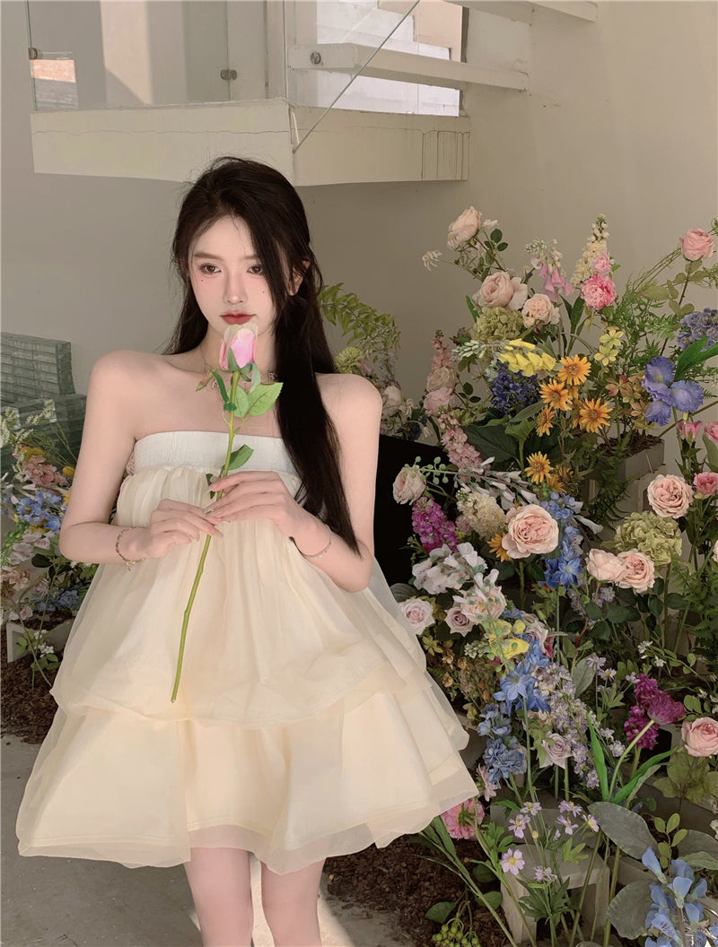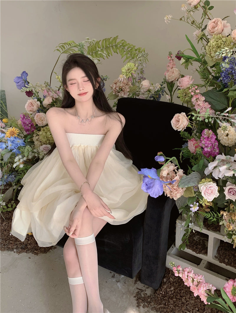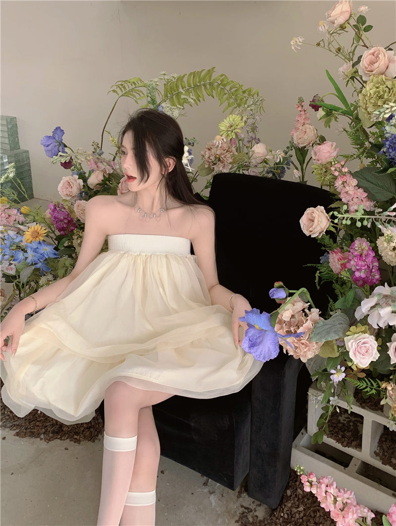 Romantic Beige Strapless Organza Mini Skirt Dreamy Party Nights Layered Puffy Short Dress AP2026