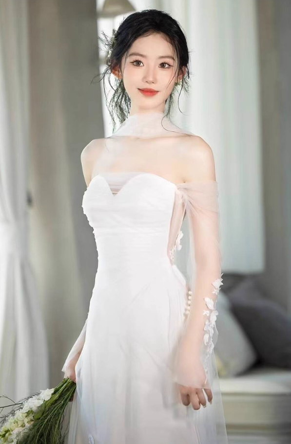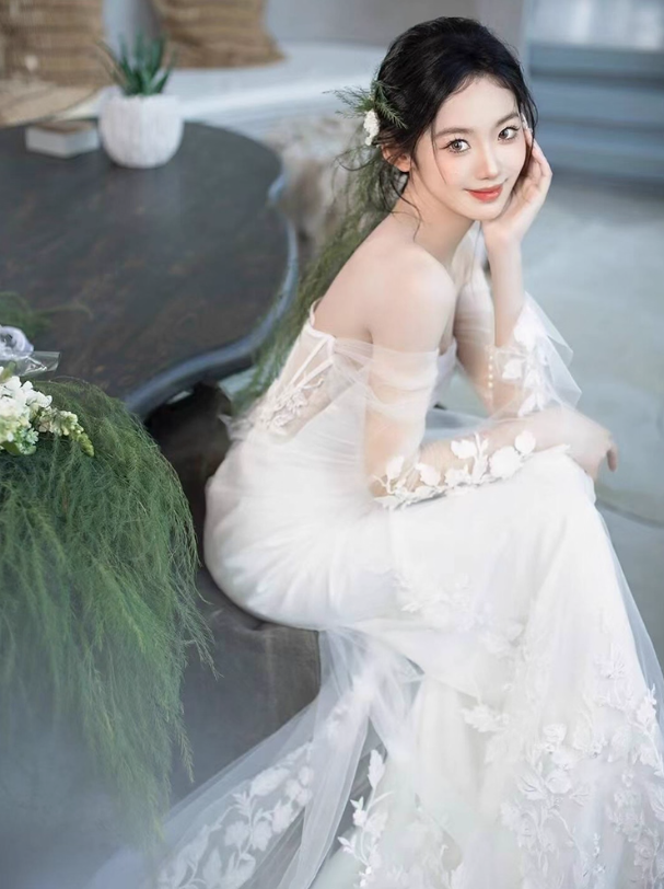 Charming Applique Lace Overlay Evening Dress Strapless Floral Accent Long Sleeve Prom Dress AP0873