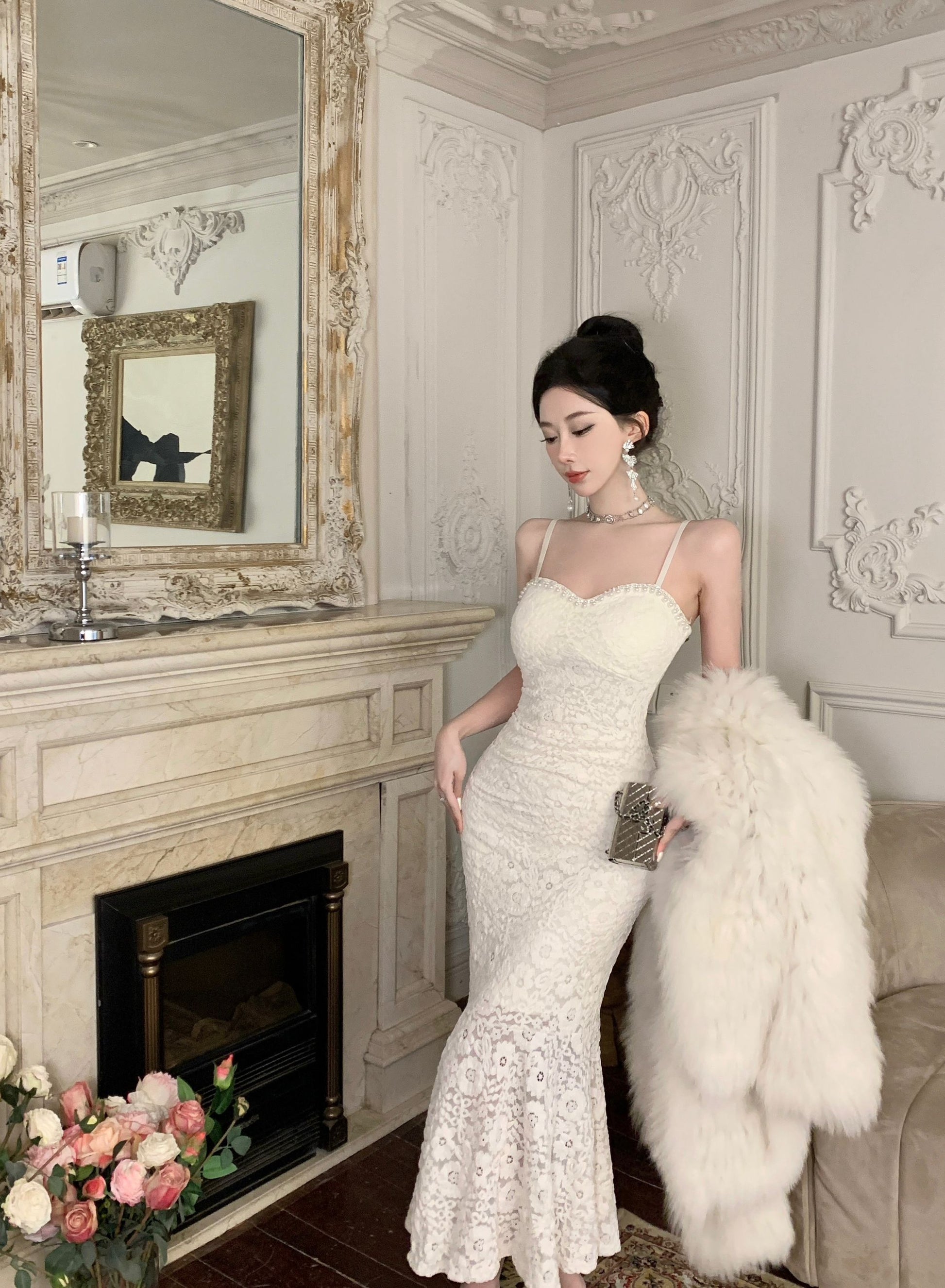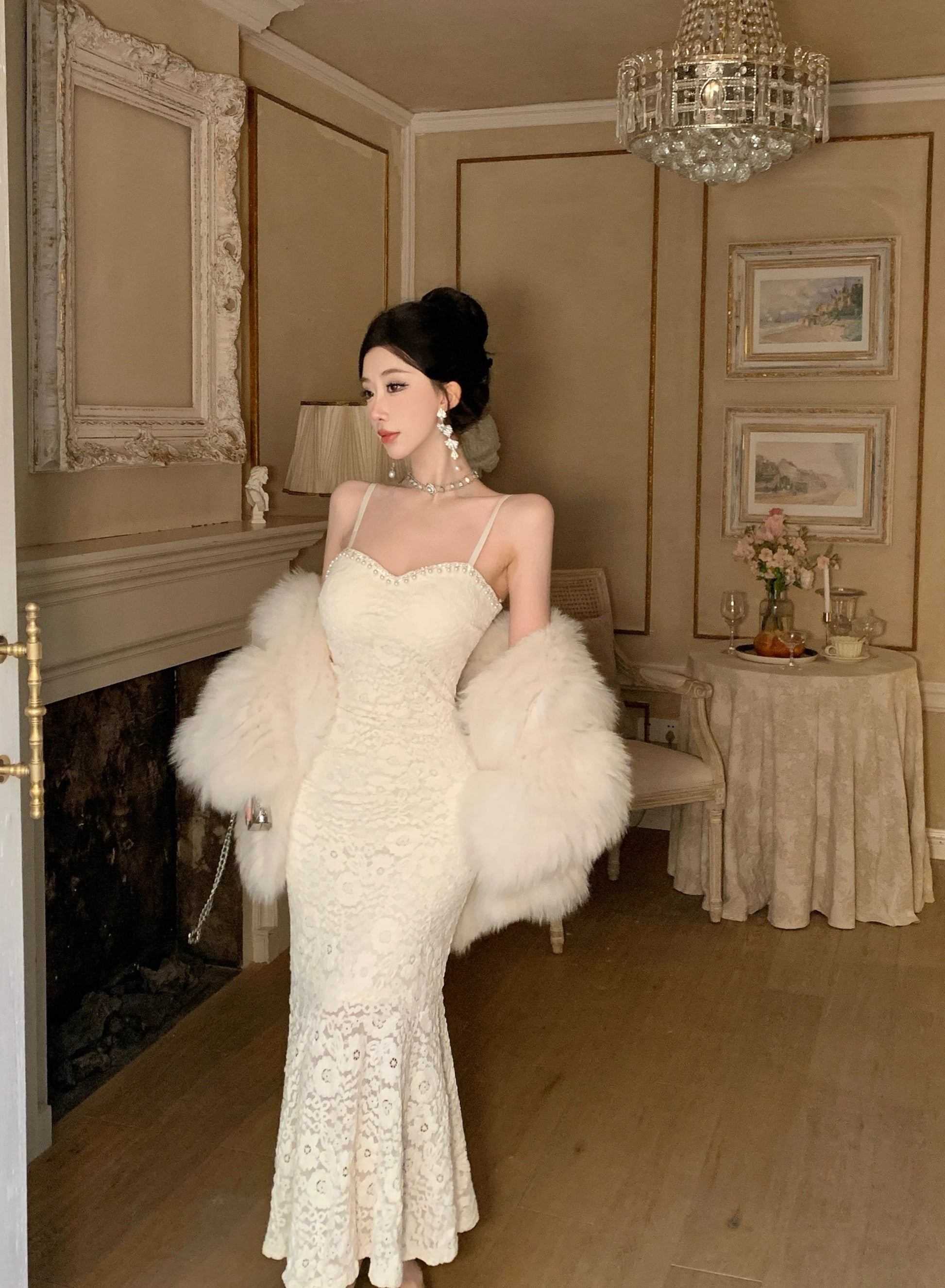 Alluring Ivory Textured Fabric Rhinestone Trimmed Midi Dress Vogue Spaghetti Straps Bodycon Fit Long Dress AP1977