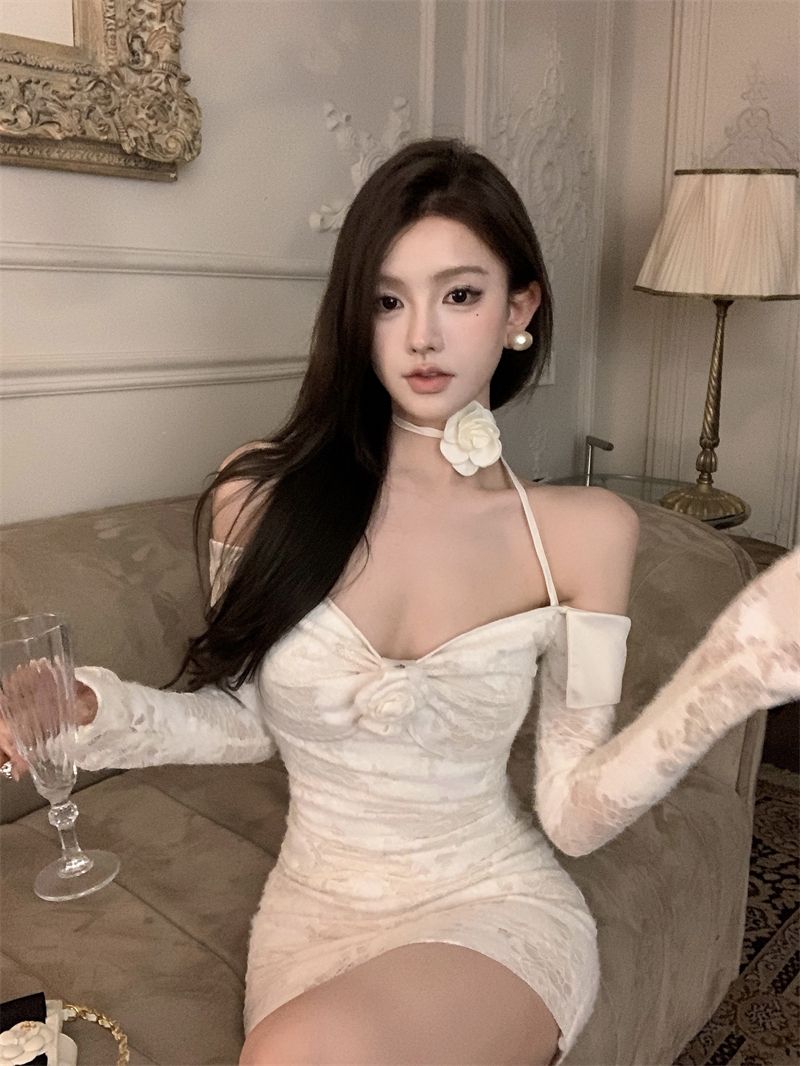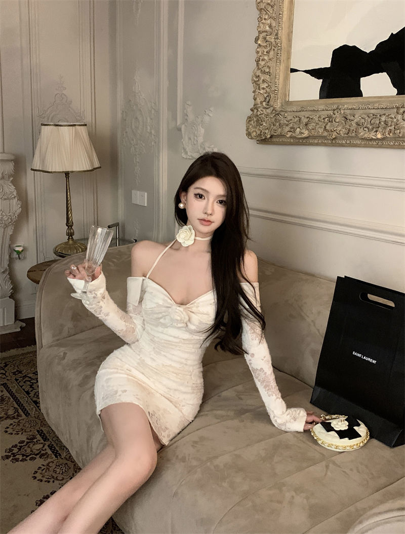 Long Sleeve Floral Print Chic Halter Skirt Charming Women Close-Fitting Short Dress AP0481