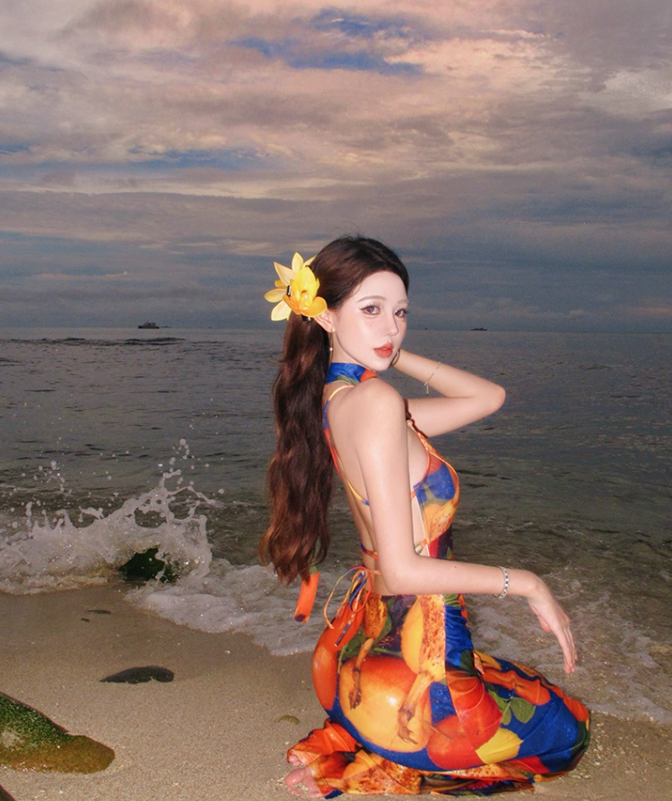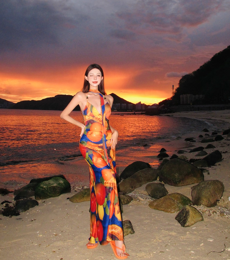 Dopamine Colorful Printed Maxi Dress Chic Gen Z Girl Vintage Sheath Halter Long Dress AP0701