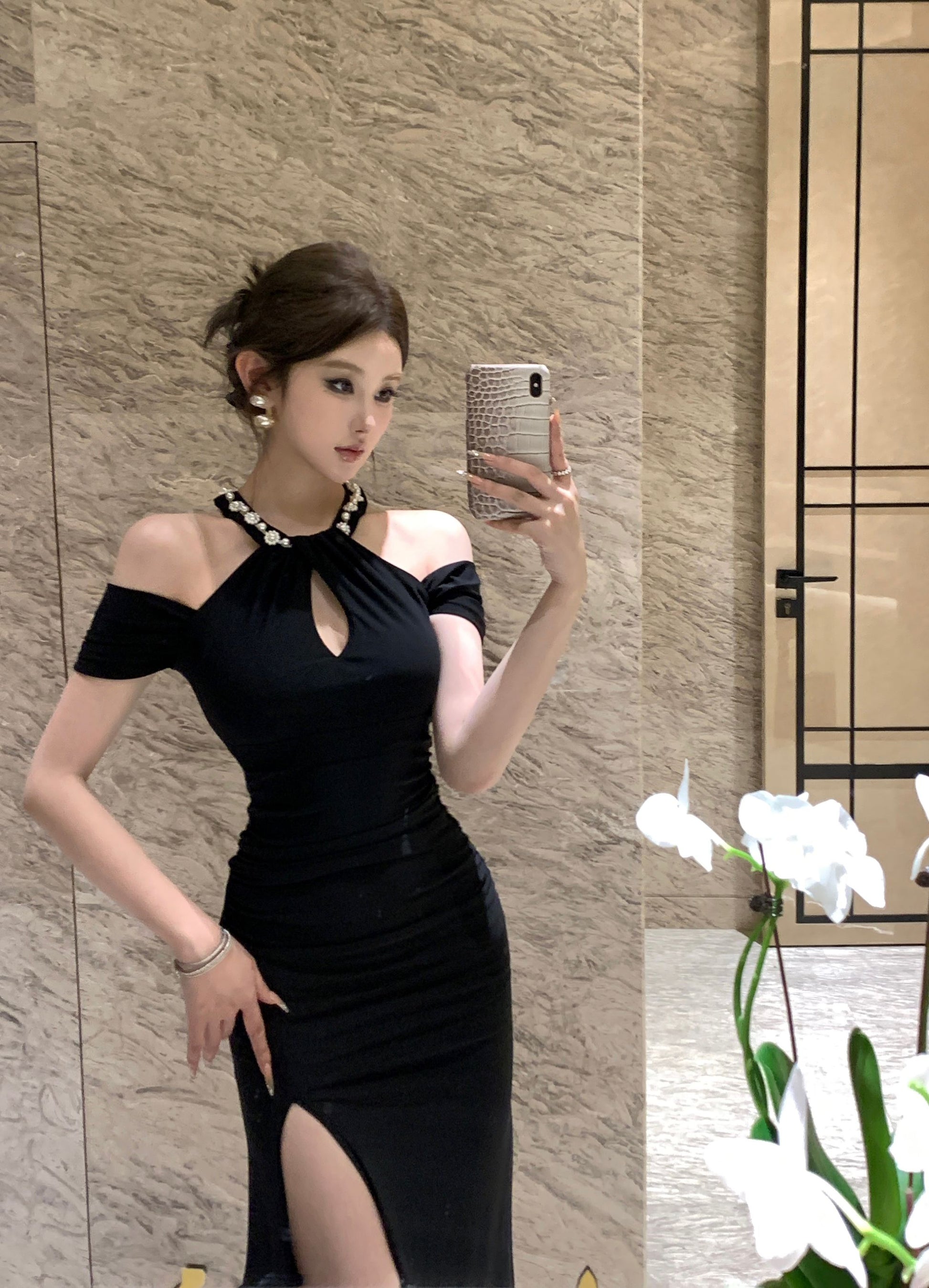 Charming Pearl Neckline Side Slit Maxi Dress Fantastic Black Off-Shoulder Slim-Fit Halter Long Dress AP1645