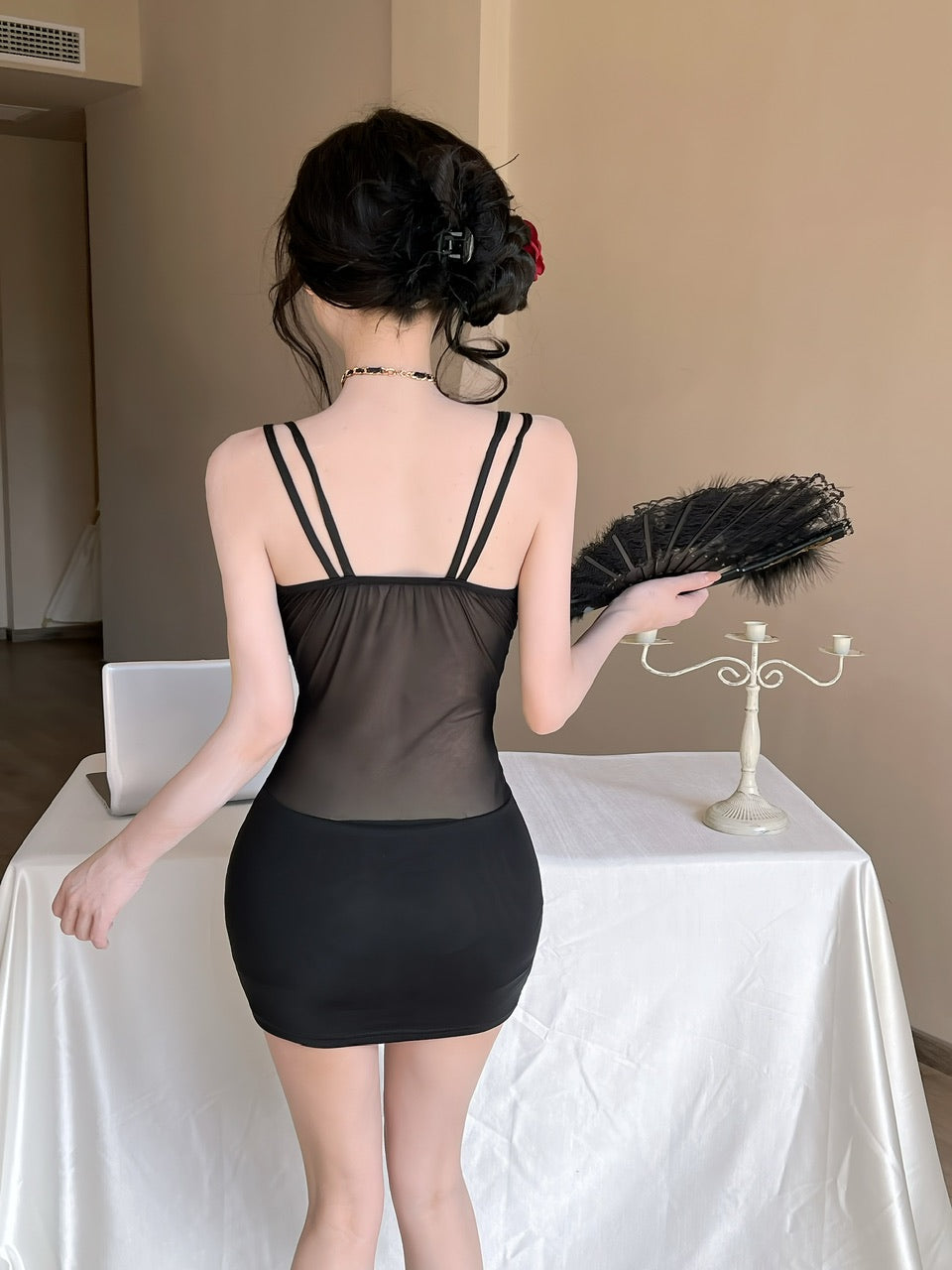 Graceful Black Sheer Mesh Bodycon Mini Skirt Exquisite Crisscross Spaghetti Straps Bra-Inspired Top Short Dress AP1811