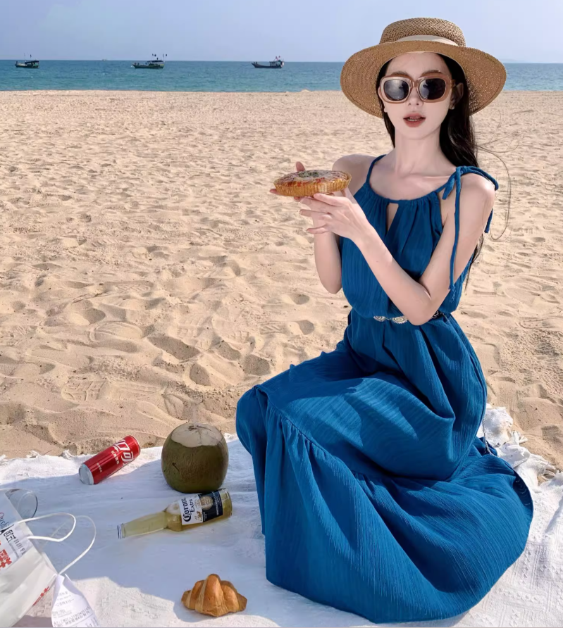 Vibrant Summer Beach Hollow-Out Maxi Dress Flowy Backless Breathable Fabric Halter Dress AP1095