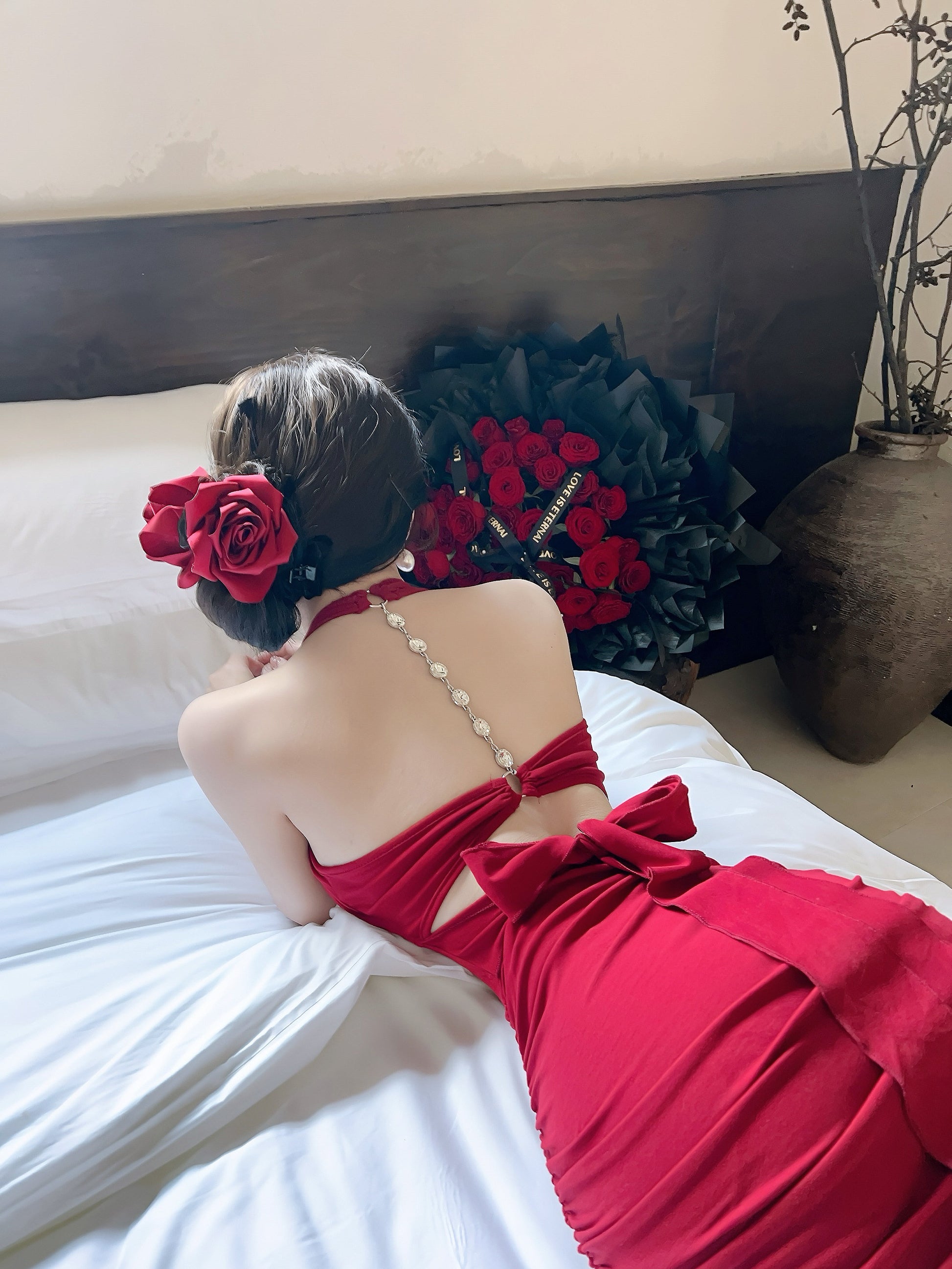 Charming Red Rhinestone-Embellished Back Mini Skirt Vogue Bow Detail Ruched Bodycon Halter Short Dress AP1909