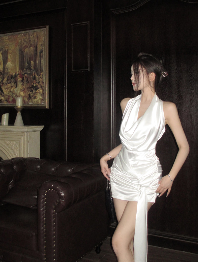 Charming Cowl Neck White Satin Mini Skirt Vogue Ruched Body Side Sash Halter Short Dress AP1983