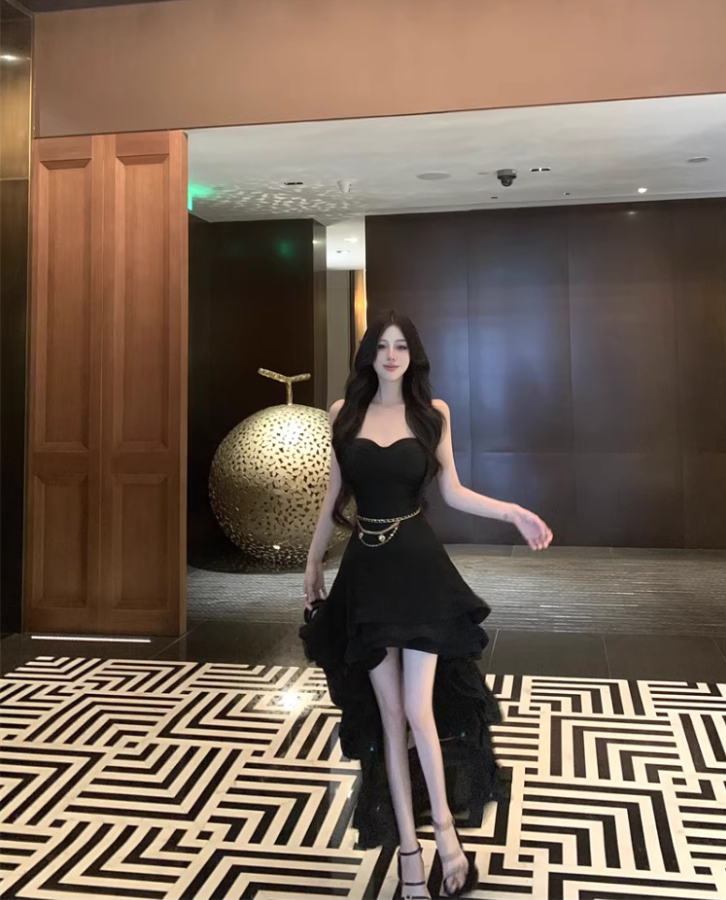 Sexy Hi-Lo Asymmetric Hem Black Maxi Dress Chic Strapless LBD Ruffled A-Line Long Dress AP1228