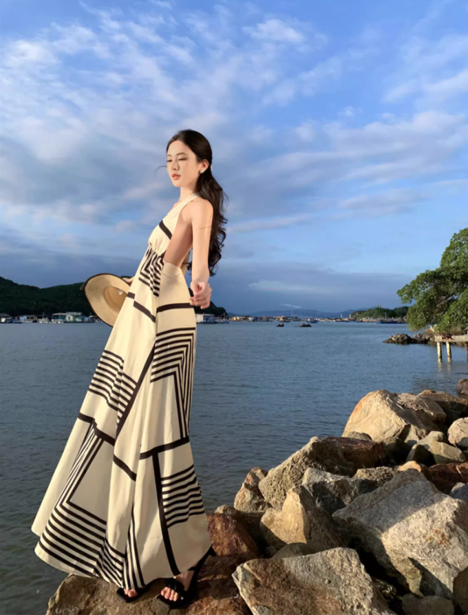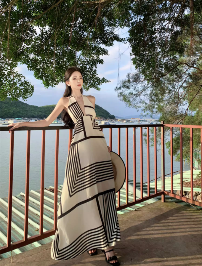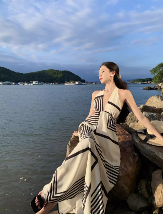 Novelty Geometric Striped Print Flowy Maxi Dress Coastal Trips Loose Style Halter Long Dress AP1299