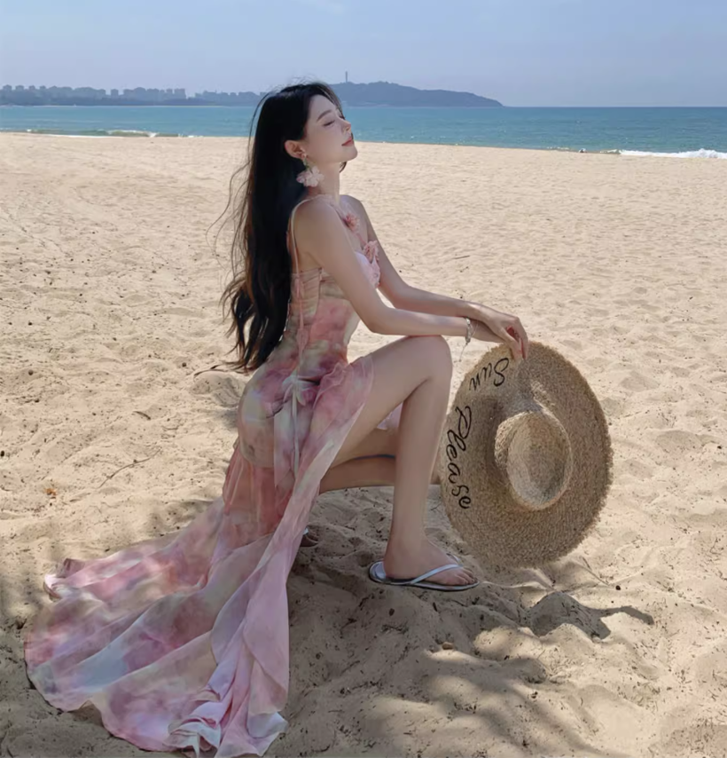 Tie-Dye Floral High-Low Hem Mini Dress One Shoulder Asymmetrical Strap Flowy Short Dress AP0564