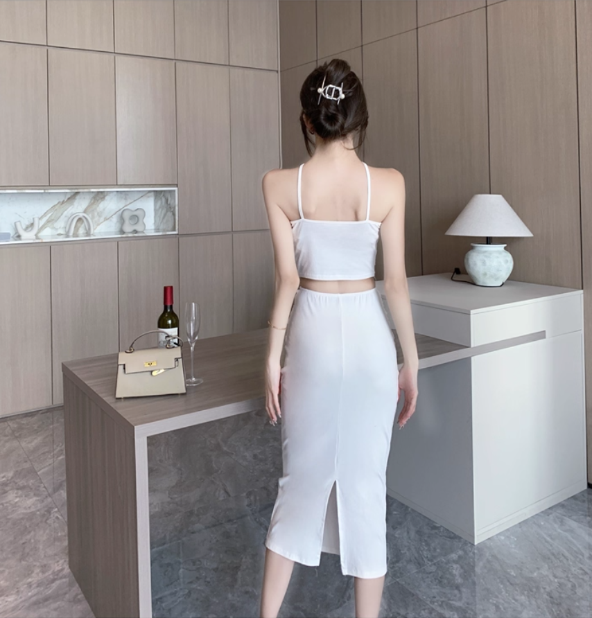 French Style White Draped Two-Piece Set Midi Dress Elegant Flower Design Open-Waist Slit Halter Long Dress AP1702