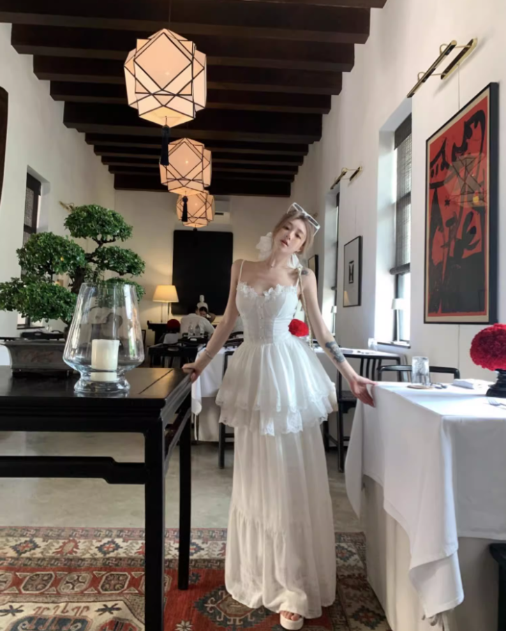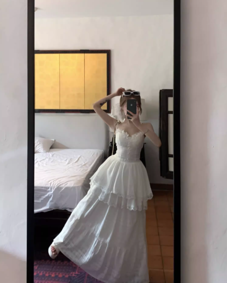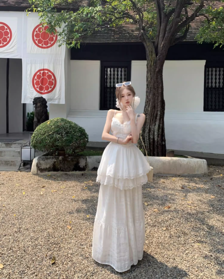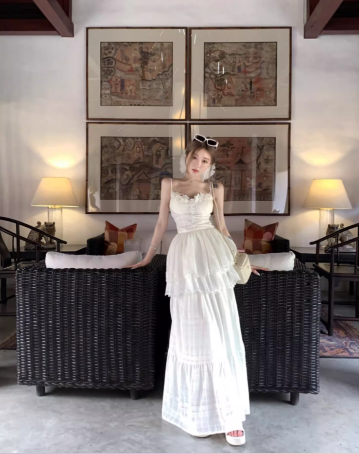 Ethereal Tiered Ruffle Hem Lace Trimmed Maxi Dress Versatile Flowy Spaghetti Strap Outdoor Events Long Dress AP1552