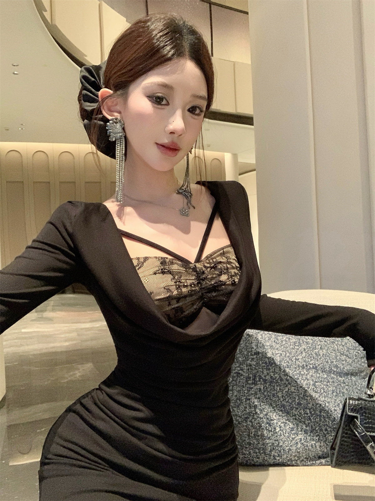 Ornate Lace Trim Mermaid Maxi Dress Playful Long Sleeve Draped Neck Long Dress AP3675