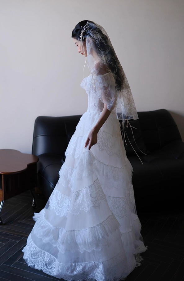 Unique Lace Splicing Breathable Mesh Engagement Dress Stylish Off-Shoulder Cinched-Waist Wedding Dress AP0749