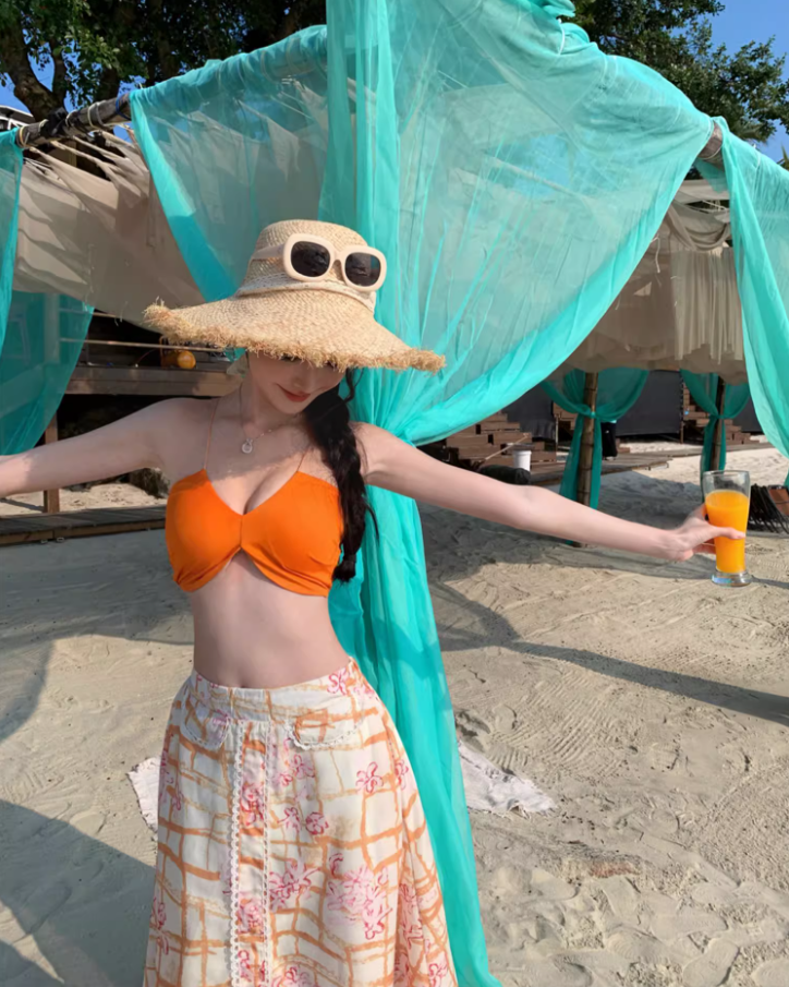 Vibrant Orange Crop Top Coastal Trips Maxi Dress Chic Flowy Two-Piece Set Printed Plaid Long Dress AP1607