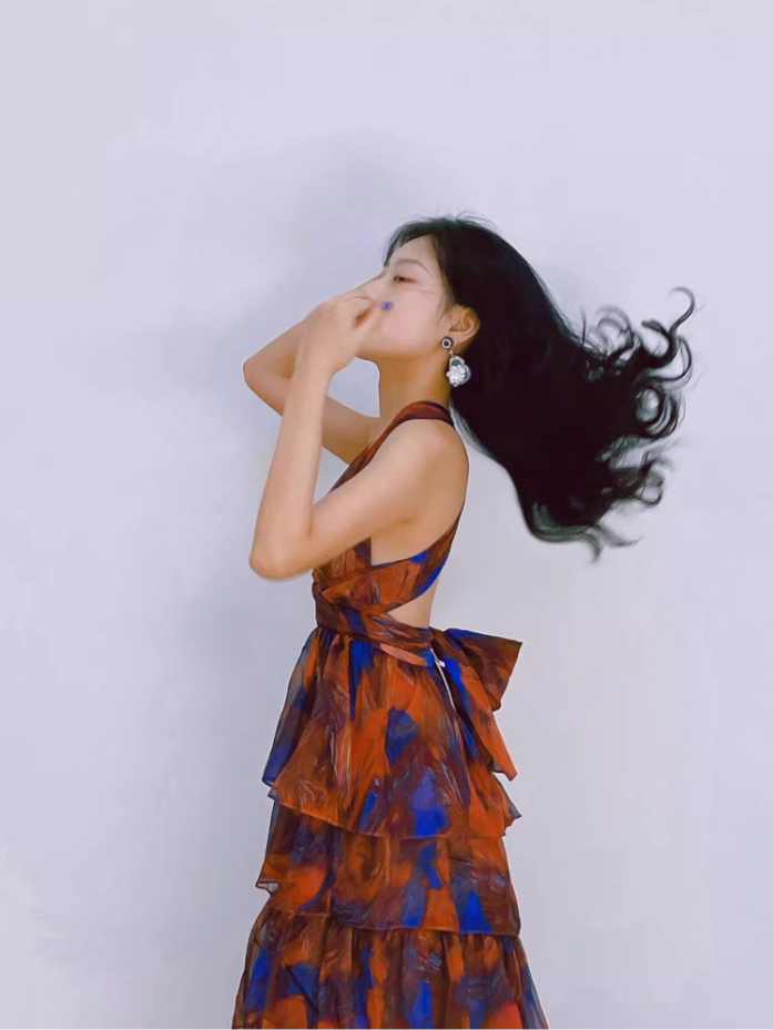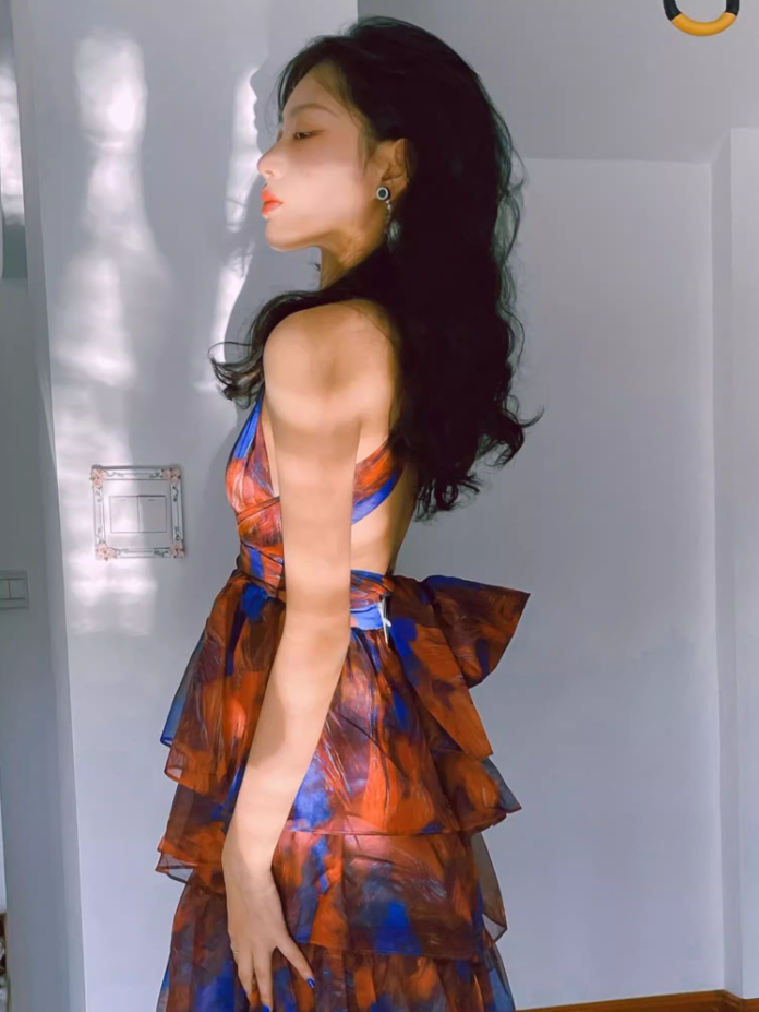 Chic Blue & Red Printed Tiered Ruffle Maxi Dress Charming Deep V-Neck Halter Long Dress AP1295
