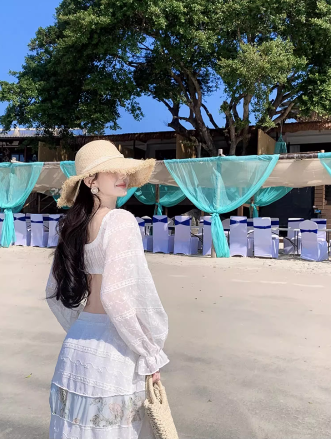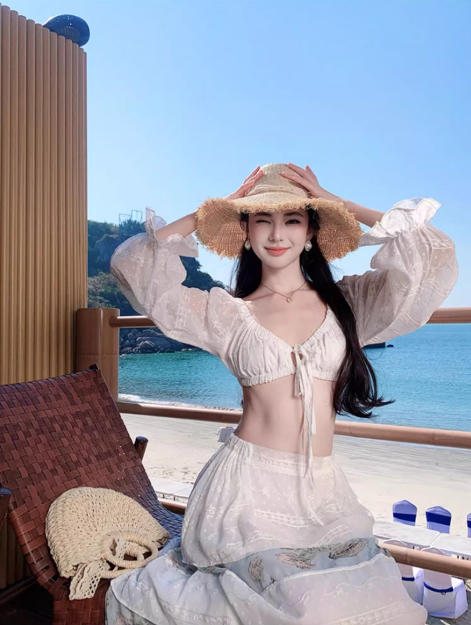 Novelty Coastal Vacays Off-Shoulder Two-Piece Set Maxi Skirt Elegant Long Puff Sleeve Crop Top Tiered Floral Print Long Dress AP1593