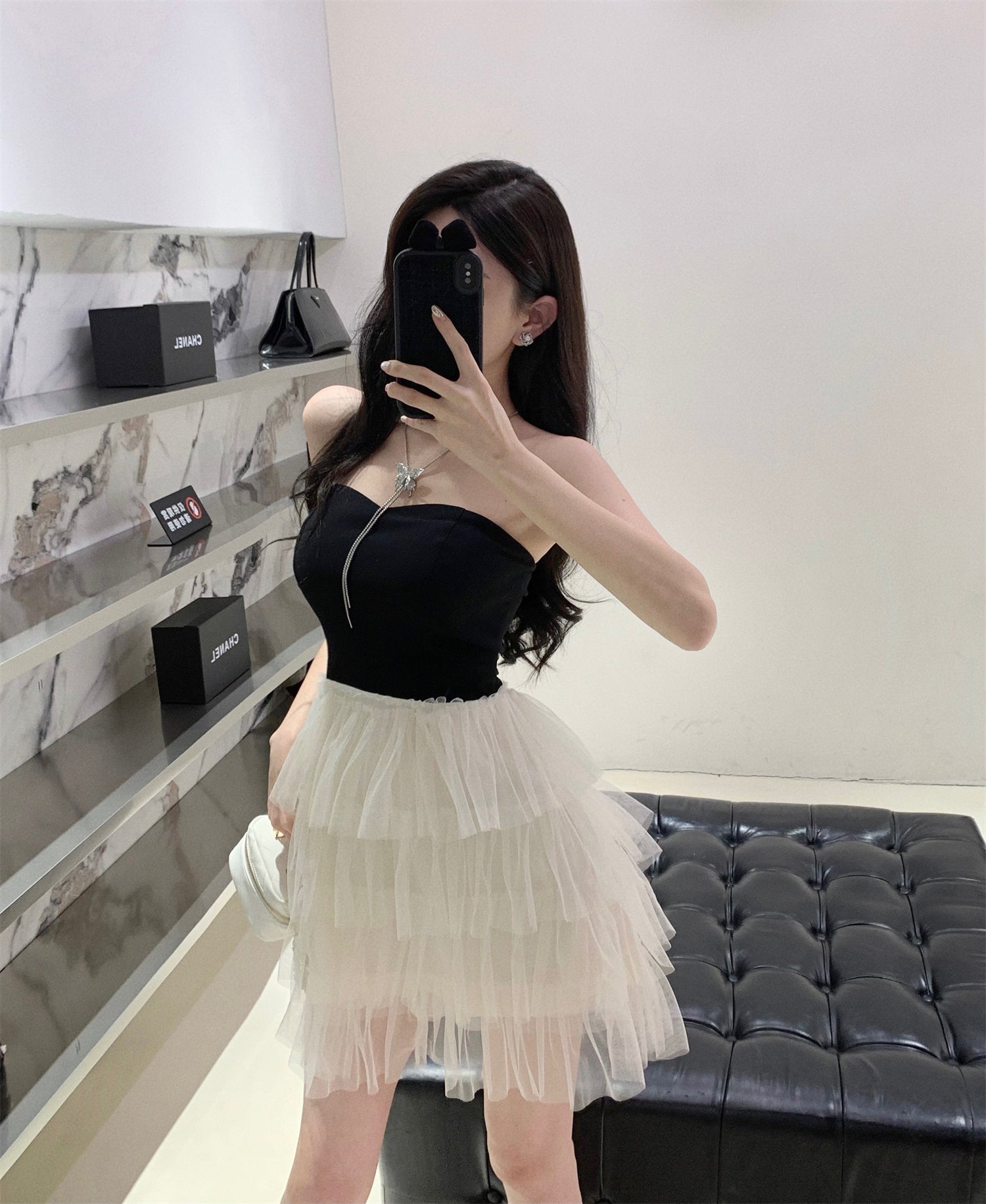 Cute Girls Strapless Black & White Splicing Mini Dress Glamorous Cascade Tiered Tulle Hem Short Dress AP1734