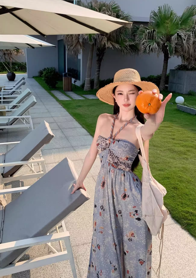 Novelty Floral Print Strapless Maxi Dress With Lining Soft Fabric Flowery Halter Long Dress AP1154