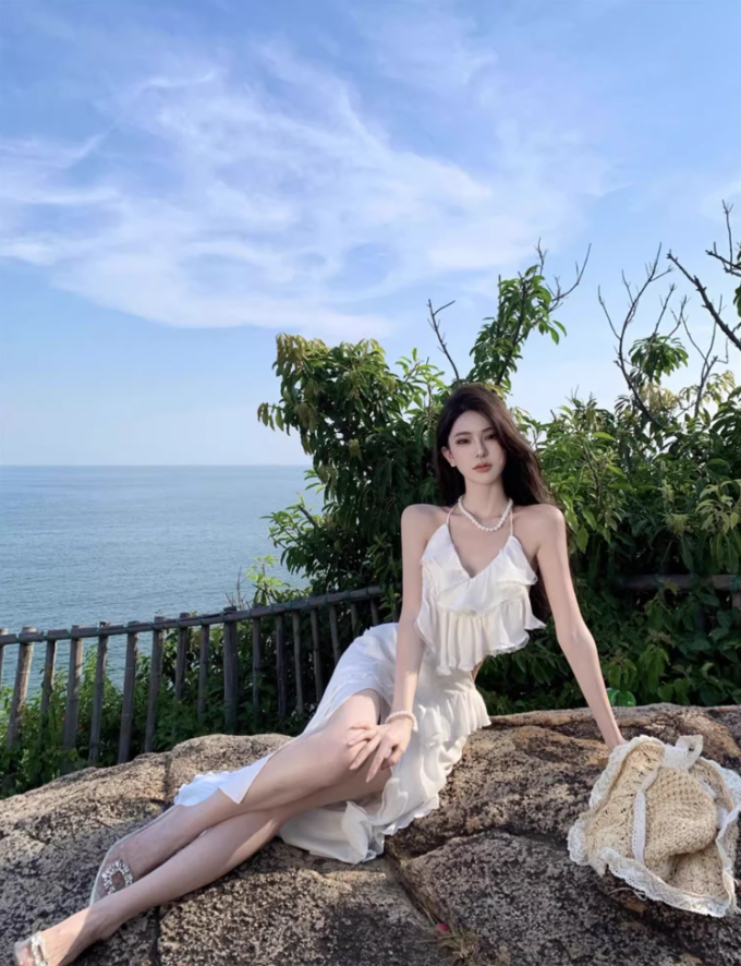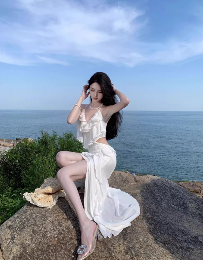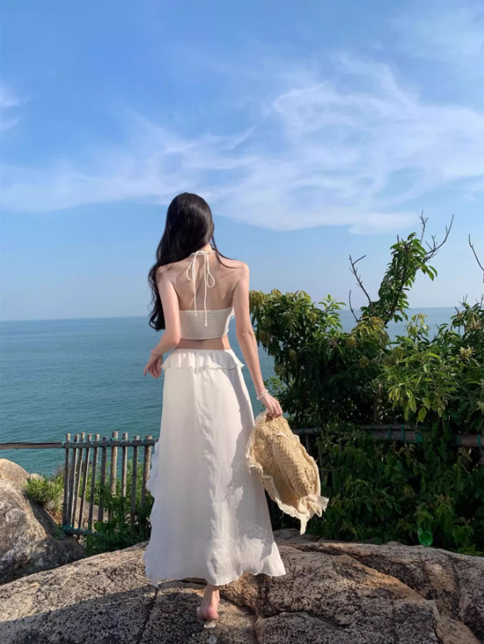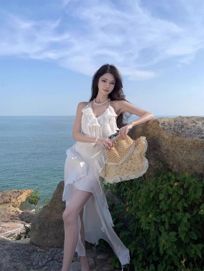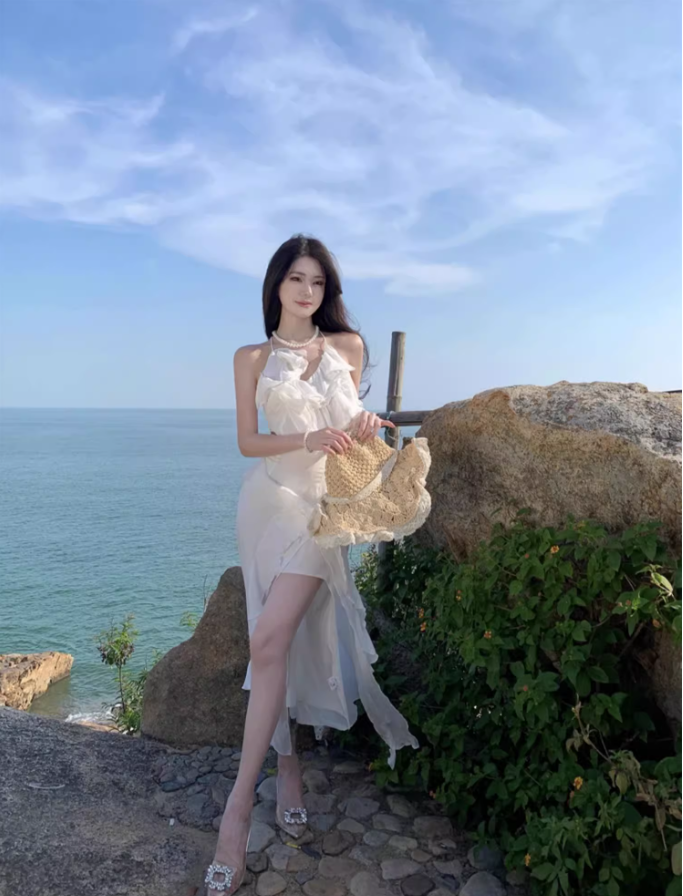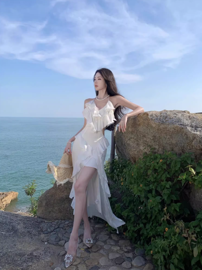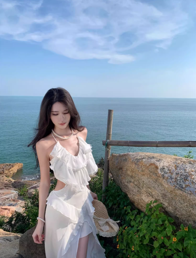 Ethereal Cascade Ruffles Trimmed White Maxi Dress Vogue Flowy Tie-Back Cutout Waist High-Slit Halter Long Dress AP1548