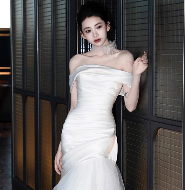 Lustrous Satin Fabric Minimalist Evening Mermaid Off-Shoulder Tulle Splicing Prom Dress AP0860