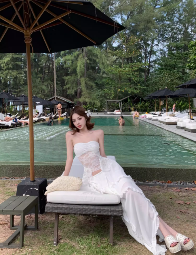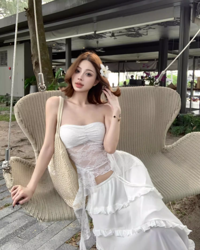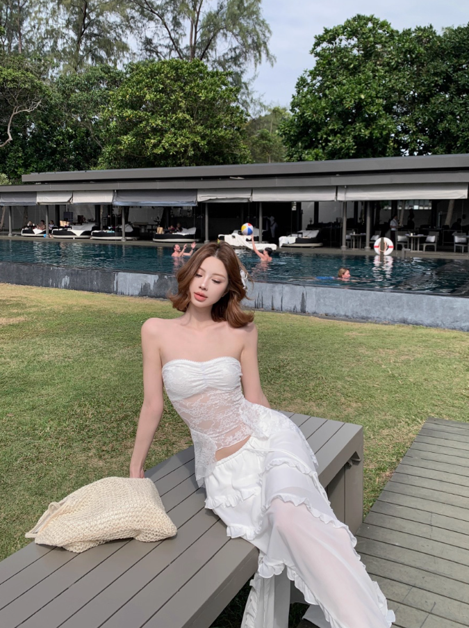 Sexy Lace Splicing Strapless Two-Piece Maxi Dress Fashionable Asymmetric Ruffled Hem Long Dress AP1403