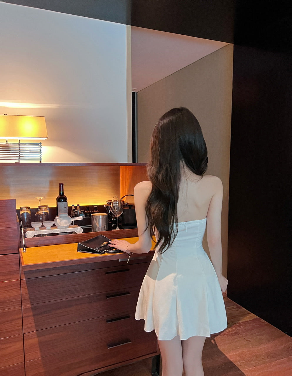 Simple Style Strapless Cream Mini Skirt Casual Outfit Zipper Back A-Line Short Dress AP1929