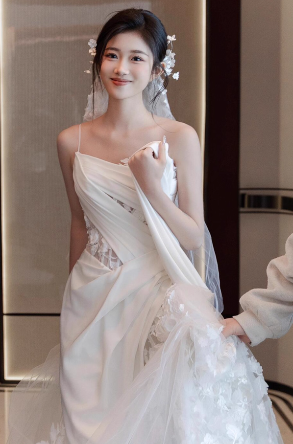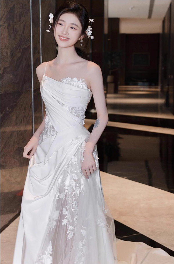 Ivory Lace Applique Sheer Panel Engagement Dress One Shoulder Wedding Dress AP0788