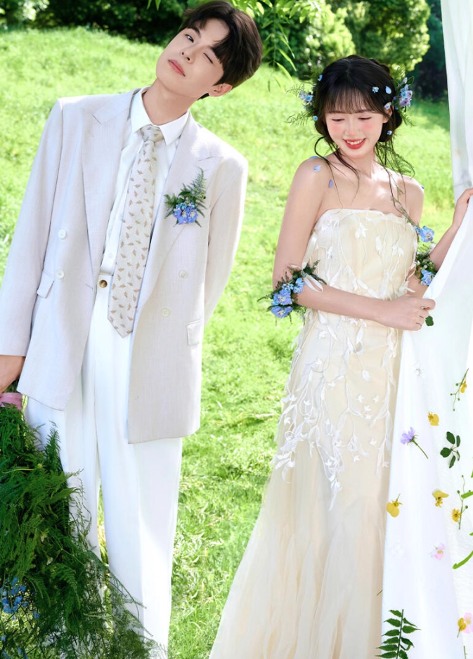 Charming Flowy Tulle Layered Hem Strapless Engagement Dress Stereo Applique Wedding Dress AP0802