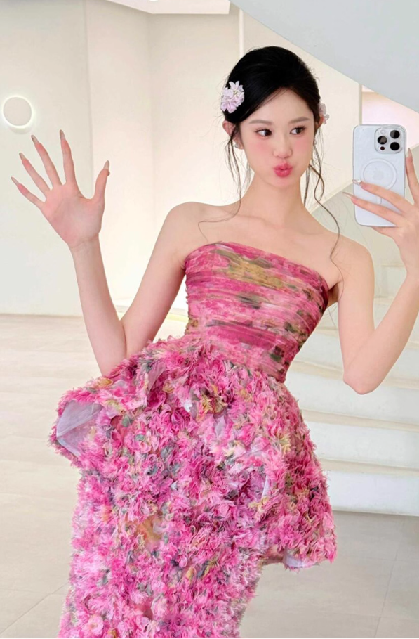 Vibrant Floral Print Ruffles Hem Maxi Dress Niche Strapless Cute Backless Prom Dress AP0781