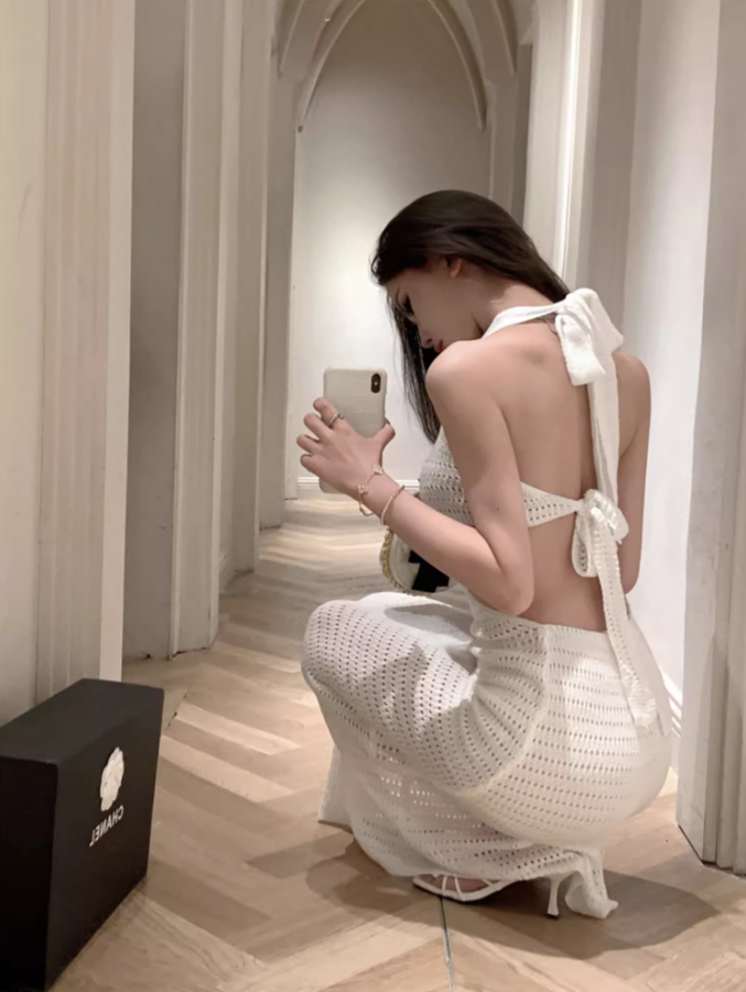 Sexy Cutout White Crochet Maxi Dress Fashion Outdoor Trips Sheath Open-Waist Halter Long Dress AP1496