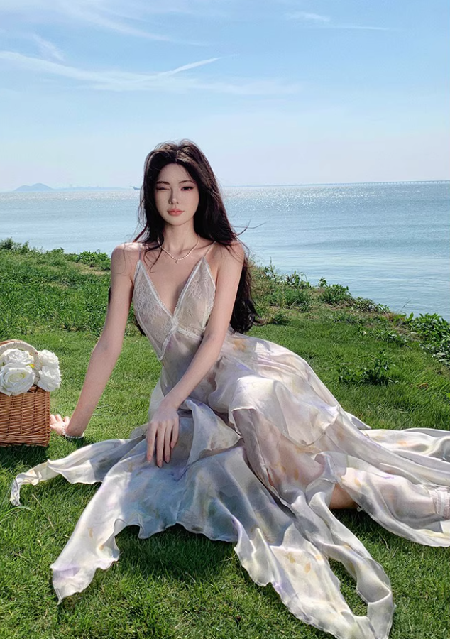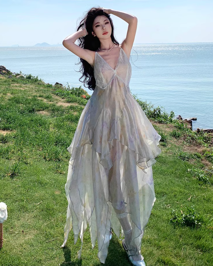 Dreamy Flowy Asymmetric Ruffles Hem Maxi Dress Floral Print Lace Splicing Sheen Fabric Long Dress AP1277