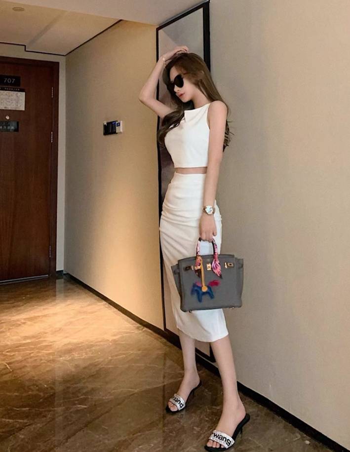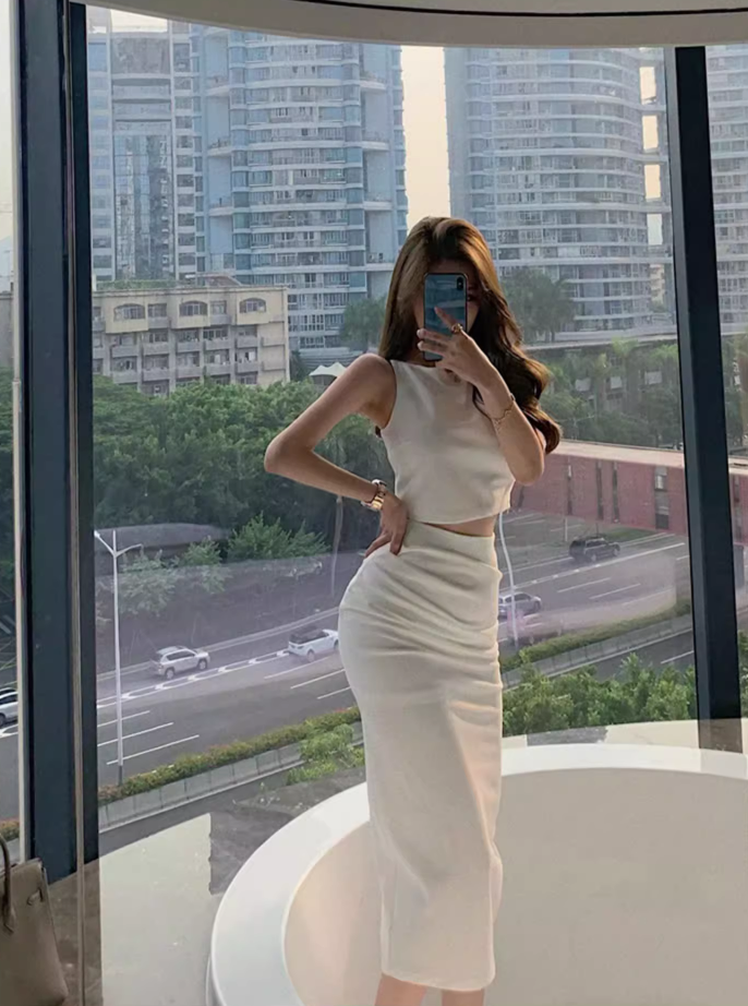 Graceful Everyday Wear White Sheath Long Dress Two-Piece Set Open-Waist Cutout Top Long Dress AP1112