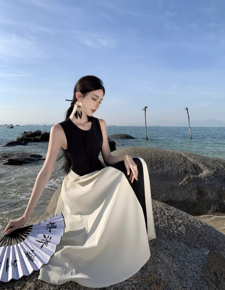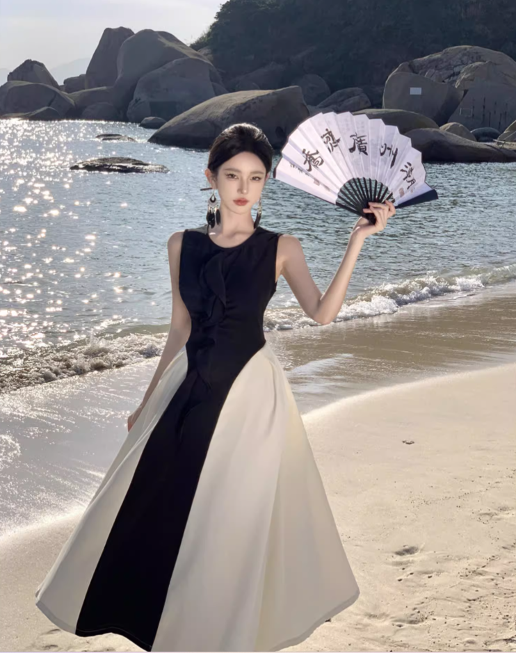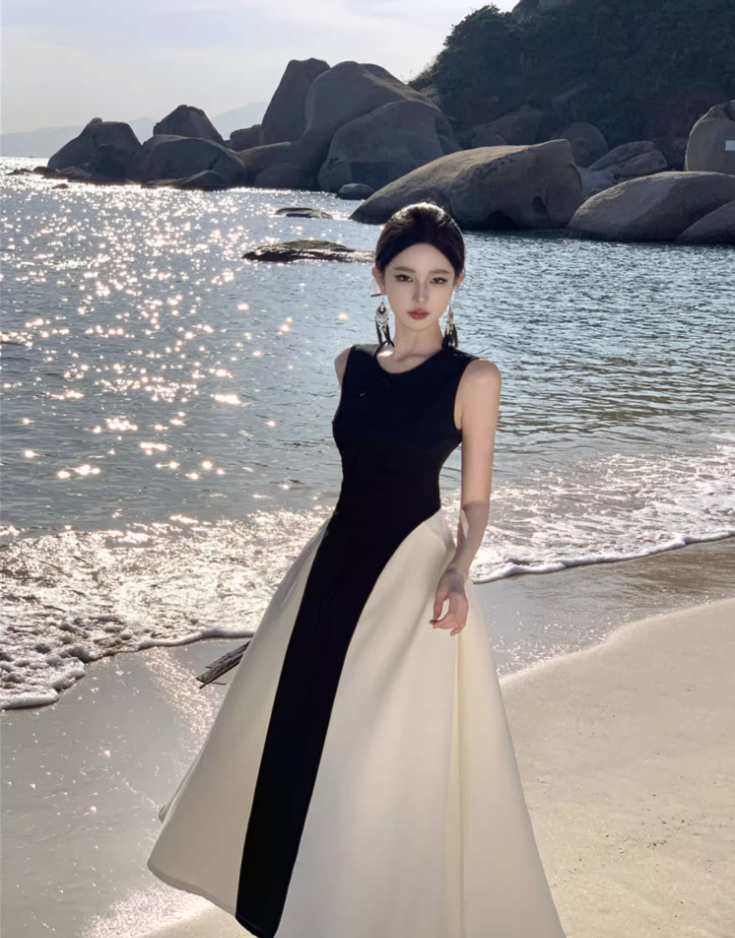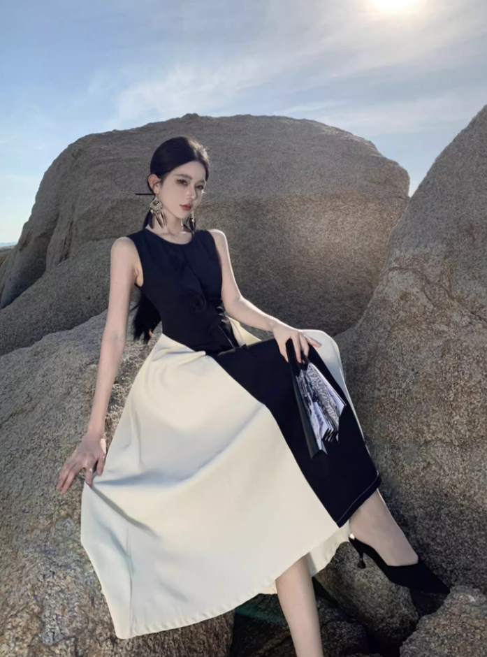 Classical Black & White Splicing Maxi Dress Photographic Sleeveless A-Line Long Dress AP1162