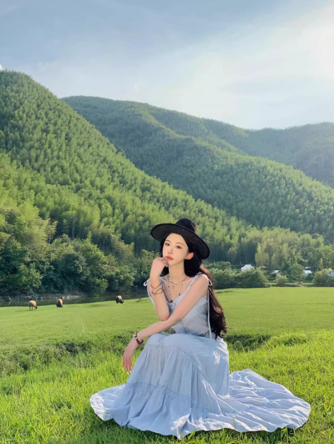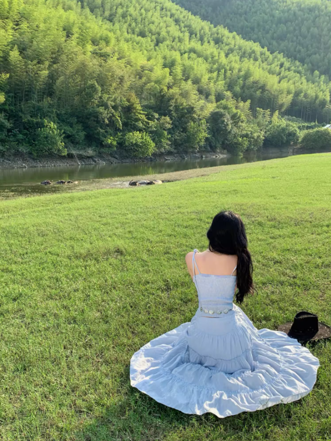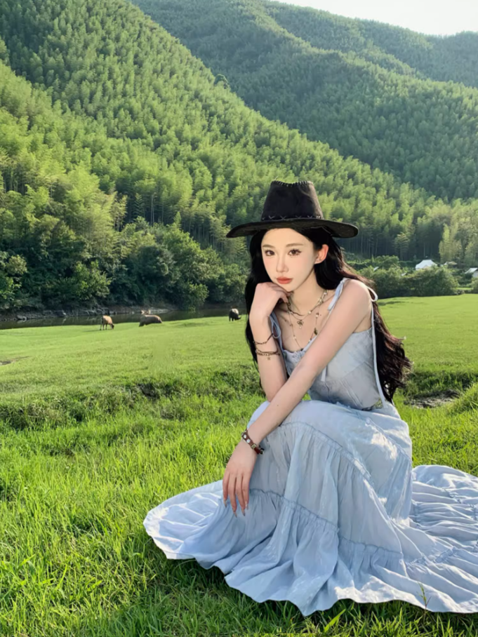 Classical Light Blue Tiered Two-Piece Set Maxi Dress Spaghetti Strap Country Vacays Cinched-Waist Long Dress AP1532