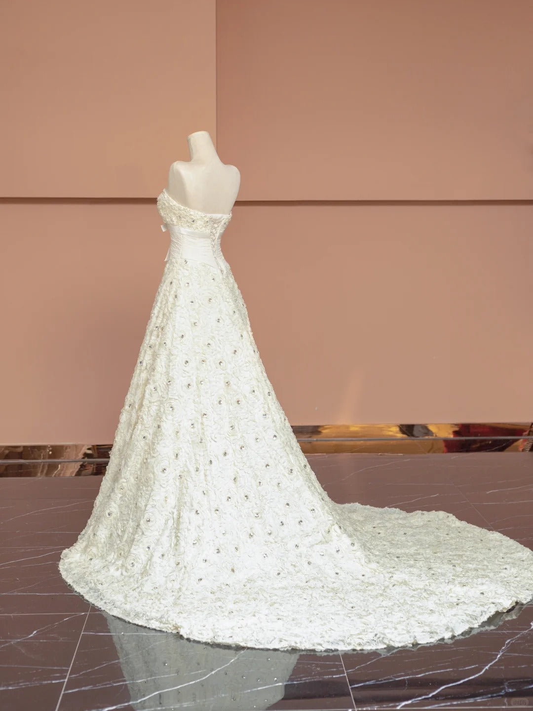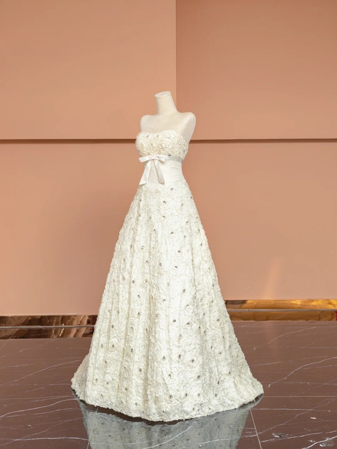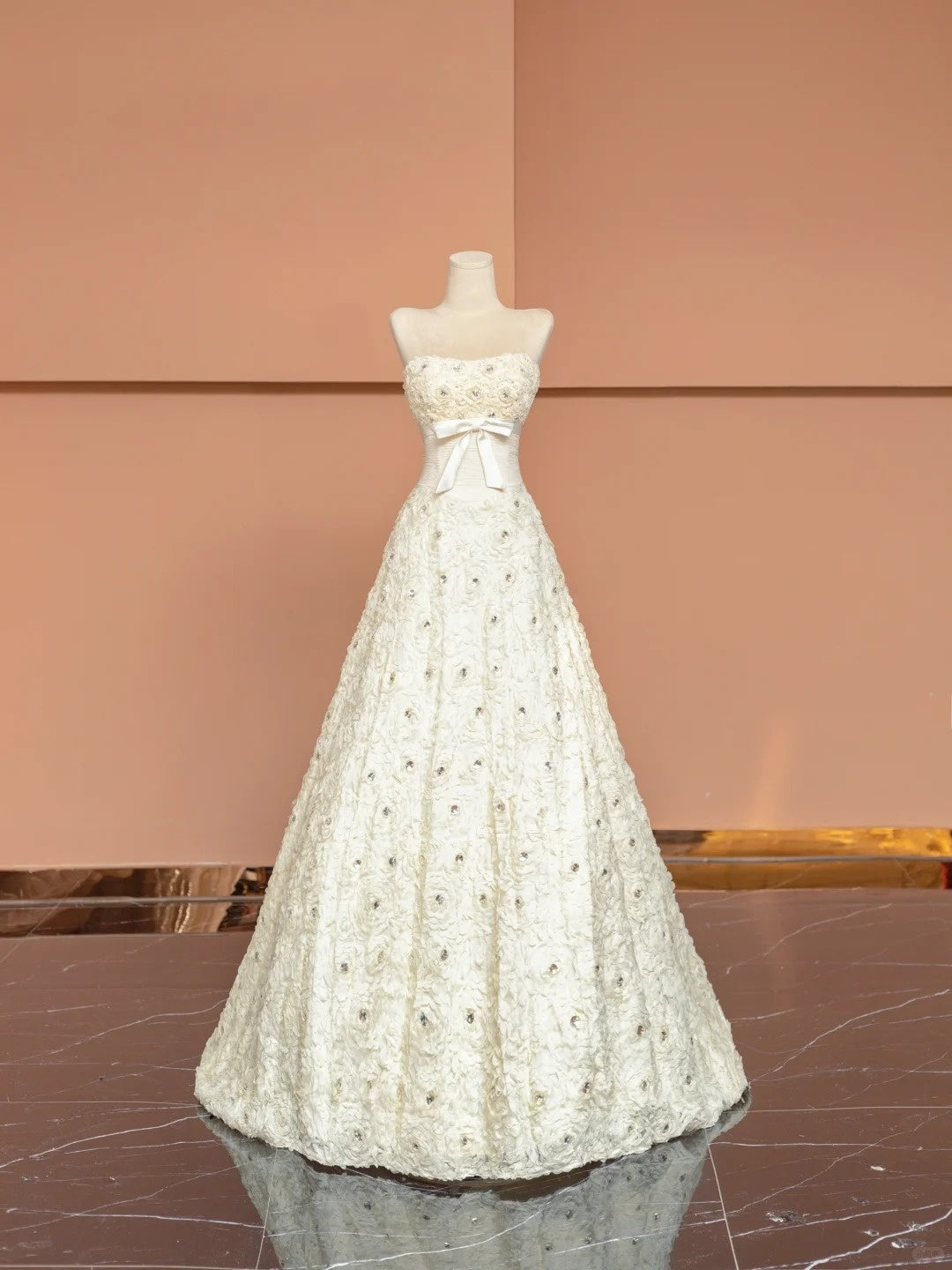 Chic Strapless A-Line Evening Gowns Bow Textured Floral Crystals Prom Dress AP2356