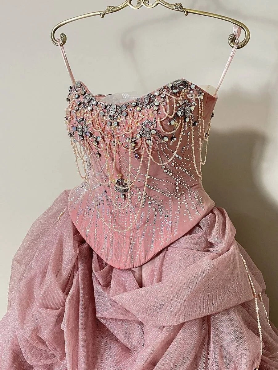 Alluring Strapless Evening Gowns A-Line Ruffled Tulle Beading Rhinestone Prom Dress AP2414