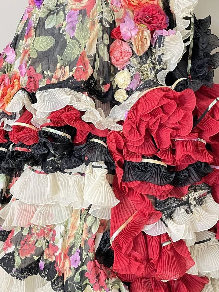 Chic A-Line Strapless Applique Evening Gowns Sequins Handmade Flowers Ruffled Prom Dress AP2418