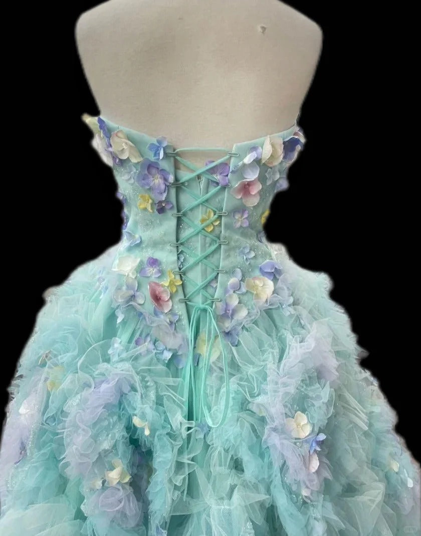 French Style A-Line Strapless Evening Gowns Sequins Applique Ruffled Tulle Prom Dress AP2420